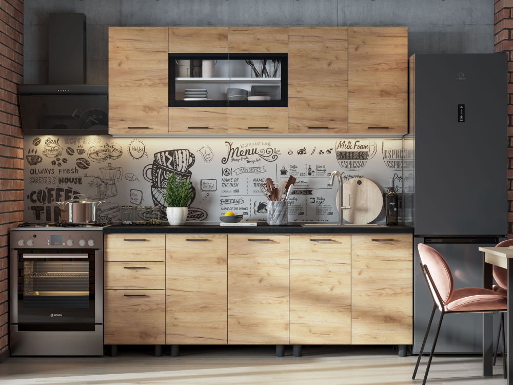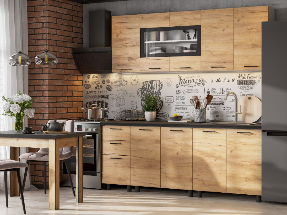 Описание Коллекция Аризона - это самый модный на сегодня дизайнерский тренд soft loft в интерьере вашей кухни. Броский, незабываемый, неординарный. Это сущая благодать для тех, кто устал от тесных хрущевок, стен и ограничений. В этой коллекции скупые черты лофта смягчаются сложным древесным декором состаренного дуба , и обрушивают на нас максимальный контраст белого корпуса и черных элементов в виде столешницы, опор, кромок, ручек. Коллекция Аризона - комплексное современное решение обустройства кухонной зоны! При изготовлении Коллекции Аризона используется ЛДСП ведущего мирового производителя Kronospan двух декоров -дуб Крафт и Белый. Плита ЛДСП. используемая при производстве этой коллекции мебели, произведена по специальному заказу концерном Kronospan с учетом повышенных требований к материалу. Она имеет более высокую плотность, позволяющую избежать при распиле, кромлении и сверловке сколы. Мебель, изготовленная из этого материала, легко переносит повторные сборки и имеет жесткую конструкцию. ЛДСП Дуб Крафт - двойная оригинальность дизайнерского рисунка древесины дуба выполнена в теплых золотистых тонах с элементами рассыхающихся темных трещин и сучков. Натуральная объемно-пористая структура покрытия многократно усиливает сходство с натуральным деревом. Визуальная глубина дополняется тактильными ощущениями , как от прикосновения к матовому полированному шелковистому срезу. ЛДСП Белый - это двойственная натура. С одной стороны он ассоциируется с чистотой хлопка, совершенством облака, а с другой - с холодом и отчужденностью Антарктиды. Искренне белый цвет опитмален по комбинаторике с любым декором и текстурой. Матовый шелк мелкозернистой шагрени углубляет ощущения сложности восприятия этого цвета. Столешницы, входящие в комплектацию Коллекции Аризона, закромлены по всему периметру распила кромкой толщиной 0,4 мм и шириной 38 мм, выполненной из первичного АБС пластика черного матового цвета. Такая обработка позволяет обеспечить защиту материала от разбухания в агрессивной влажной среде и обеспечивает долгий срок службы кухонного гарнитура. Столешница декора Черный мрамор изготовлена на основе древесно-стружечной плиты, покрытой слоистым пластиком. Столешница выдерживает большую нагрузку, а декоративный пластик гигиеничен, легко очищается и является экологически чистым материалом. Поверхность столешницы устойчива к ударам, к воздействию бытовой химии, кислотам, к солнечному УФ излучению (сохраняет цвет). Пластик столешницы имеет повышенную термо- и влагостойкость. Декор Черный мрамор - это цвет роскоши, утонченности, цвет черной пелены ночи. Он является противоположностью белого. В нем кроется бунт, тайна, неизвестность. Столешница декора Черный мрамор имеет приглушенный матовый шелковый отлив, сопряженный с шероховатой фактурой, делающий черный цвет еще более глубоким и бездонным. При изготовлении кухни Аризона используются прозрачные стекла прямоугольной формы толщиной 4мм. По периметру стекла нанесена фотопечать в виде рамки глубокого черного цвета. Так же стекло обработано еврокромкой, что исключает возможность случайного пореза об открытые края стекла. Стекла вклеиваются во фрезерованные пазы сразу на фабрике высокопрочным клеем, поэтому створки со стеклянными элементами поступают в уже собранном виде.