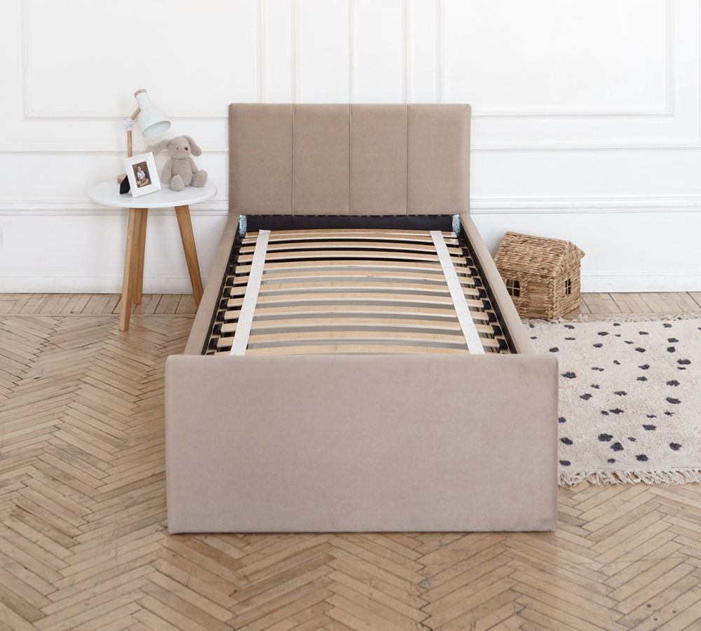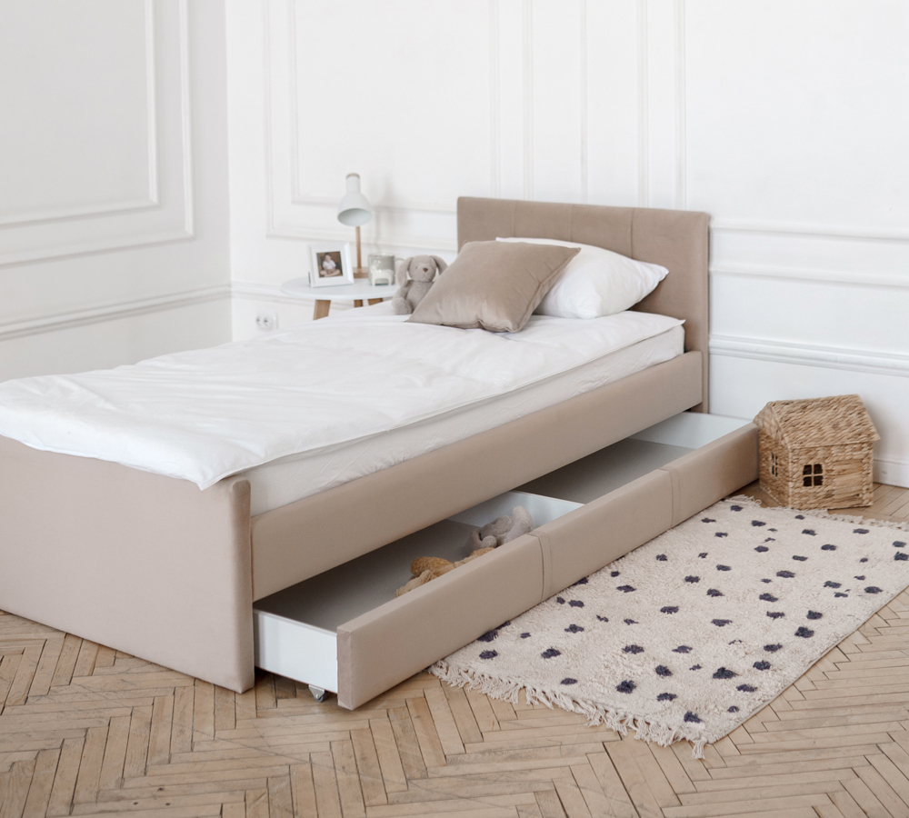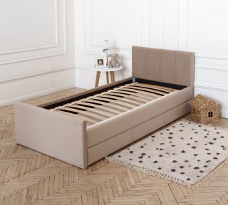Односпальная кровать 90х200 см BLOOM с выдвижным ящиком и мягким изголовьем, ортопедическое основание, для дома и спальни,усиленные ламели, велюр бежевый, IZZIHOME