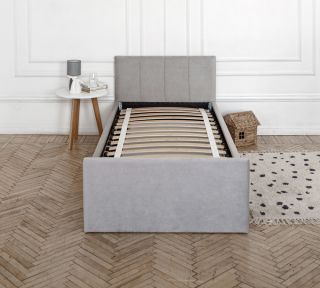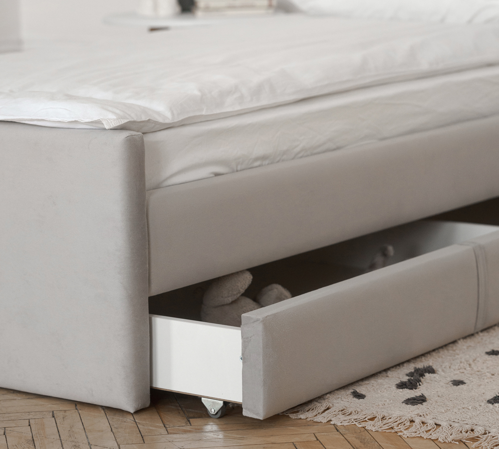 Односпальная кровать 90х200 см BLOOM с выдвижным ящиком и мягким изголовьем, ортопедическое основание, для дома и спальни,усиленные ламели, велюр серый, IZZIHOME