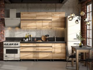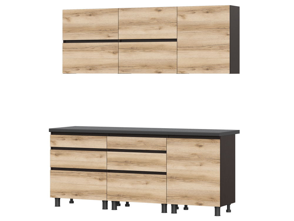 Описание Ярко выраженные сучья и трещины позволяют воплотить в интерьере стиль жесткий лофт благодаря своему идеальному сочетанию с грубым кирпичом, металлом, бетоном. Все это - Коллекция Берген, представленная своим первым модулем - Кухня Берген 2,0 Интегрированные ручки закромлены контрастной кромкой, позволяющей акцентировать внимание на лаконичности и красоте простой геометрии фасадов. Массивная цельная столешница, шариковые направляющие полного выдвижения, черные лофт-опоры модулей, ЛДВП Венге в партнерстве с корпусом Венге. При изготовлении кухни Берген используется ЛДСП ведущего мирового производителя Kronospan двух декоров -дуб Делано и Венге. Плита ЛДСП, используемая при производстве этой кухни, произведена по специальному заказу концерном Kronospan с учетом повышенных требований к материалу. Она имеет более высокую плотность, позволяющую избежать при распиле, кромлении и сверловке сколы. Мебель, изготовленная из этого материала, легко переносит повторные сборки и имеет жесткую конструкцию. Дуб Делано - это несколько пористая хорошо выраженная фактура древесины дуба с природными пороками в виде темных сучьев и нечастых глубоких темных трещин. Декор Делано имеет теплый орехово-бежевый оттенок в палитре от совершенно светлых тонов до ультра темных в изъянах древесины. Безусловная декоративность древесной фактуры состаренного антикварного дерева подчеркивается ярко выраженными годичными слоями и сердцевидными лучами сучков. Венге - это древесная ровноволокнистая крупная текстура, несколько грубая, высоко декоративная. Палитра Венге очень темная, цвета горького шоколада с черными прожилками. Венге - редкая и очень ценная порода тропической древесины, первые упоминания о которой появились в 1904 году. Древесина дерева венге темнеет после спиливания. Свежий срез имеет золотисто-коричневый цвет, а позднее приобретает насыщенный окрас, постепенно становясь темно-коричневым. Мебель с использованием декора Венге делает интерьер статусным, дорогим, играя на контрасте со светлыми оттенками. Столешница, входящие в комплектацию Кухни Берген, закромлена по всему периметру распила кромкой толщиной 0,4 мм и шириной 38 мм, выполненной из первичного АБС пластика черного матового цвета. Такая обработка позволяет обеспечить защиту материала от разбухания в агрессивной влажной среде и обеспечивает долгий срок службы кухонного гарнитура. Столешница декора Черный мрамор изготовлена на основе древесно-стружечной плиты, покрытой слоистым пластиком. Столешница выдерживает большую нагрузку, а декоративный пластик гигиеничен, легко очищается и является экологически чистым материалом. Поверхность столешницы устойчива к ударам, к воздействию бытовой химии, кислотам, к солнечному УФ излучению (сохраняет цвет). Пластик столешницы имеет повышенную термо- и влагостойкость. Декор Черный мрамор - это цвет роскоши, утонченности, цвет черной пелены ночи. Он является противоположностью белого. В нем кроется бунт, тайна, неизвестность. Столешница декора Черный мрамор имеет приглушенный матовый шелковый отлив, сопряженный с шероховатой фактурой, делающий черный цвет еще более глубоким и бездонным. Каждый нижний модуль кухни Берген укомплектован двумя декоративными передними опорами цилиндрической формы цвета Черный хром и двумя задни