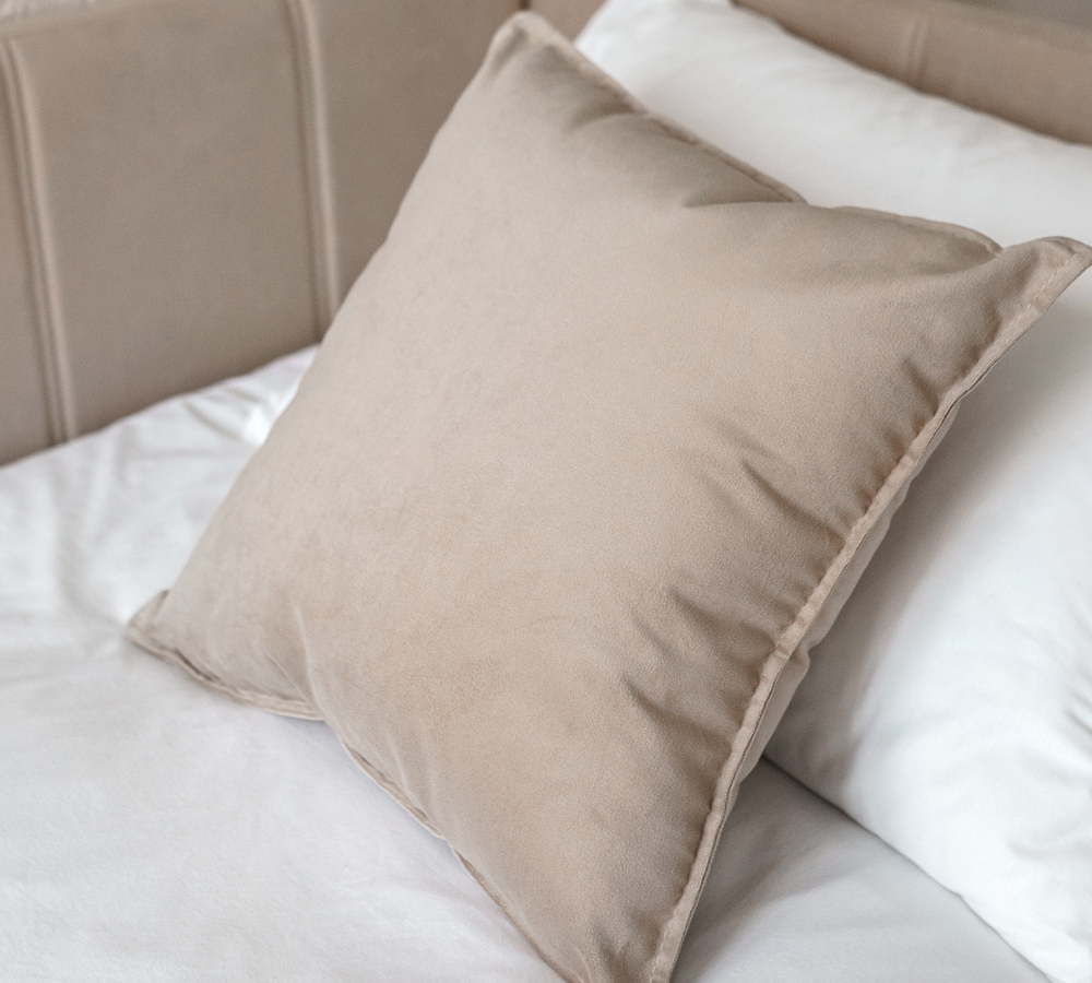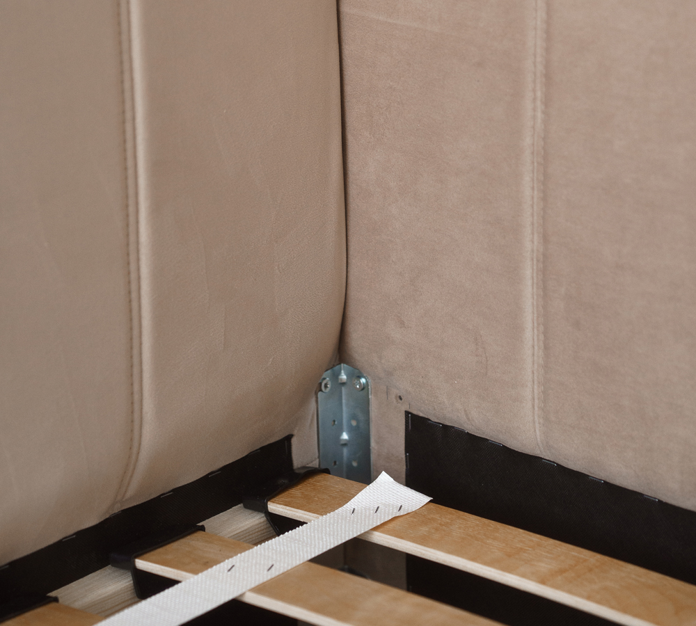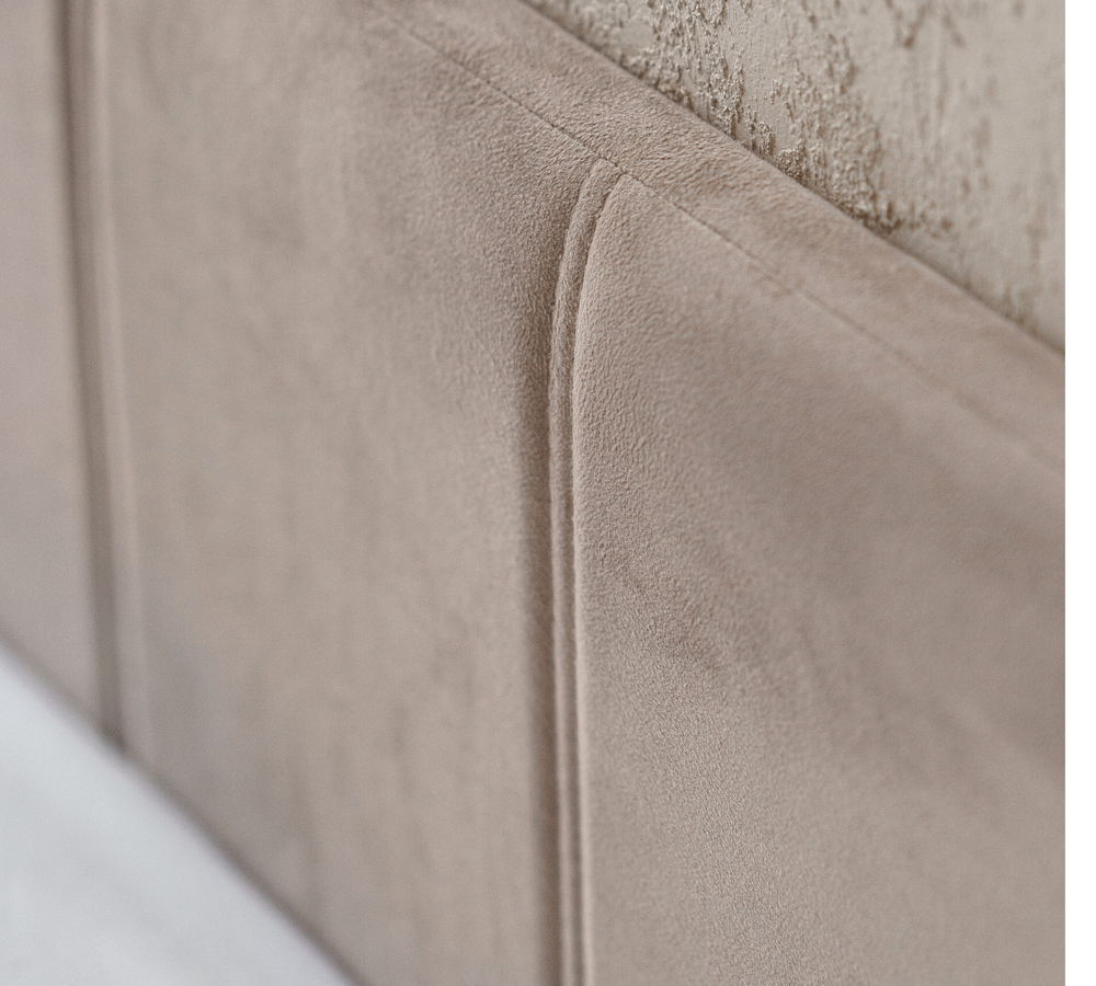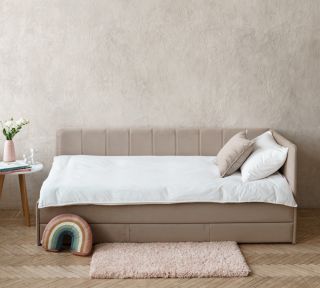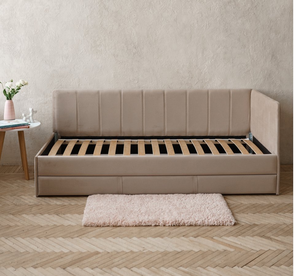 Односпальная угловая кровать COLINS 90х200 бежевая с ящиком для хранения, с мягким изголовьем, для дома, для спальни, ортопедическое основание, ламели усиленные, ящик для белья, велюр.