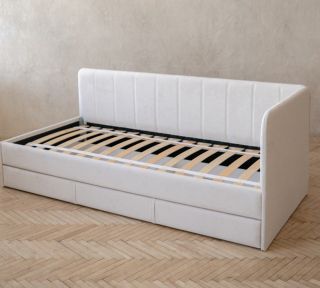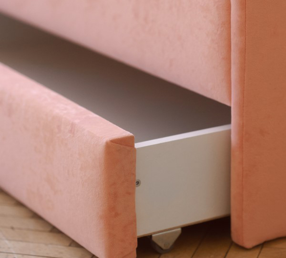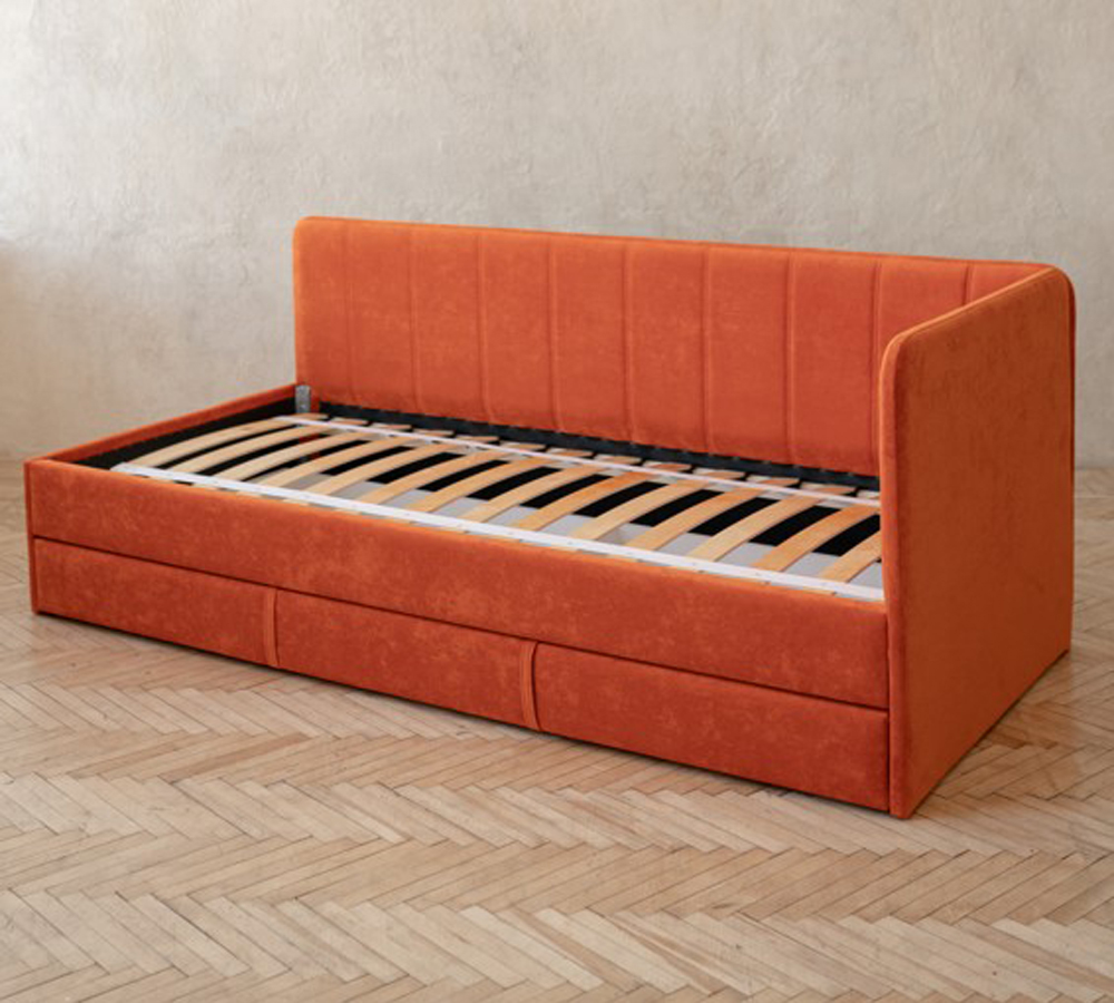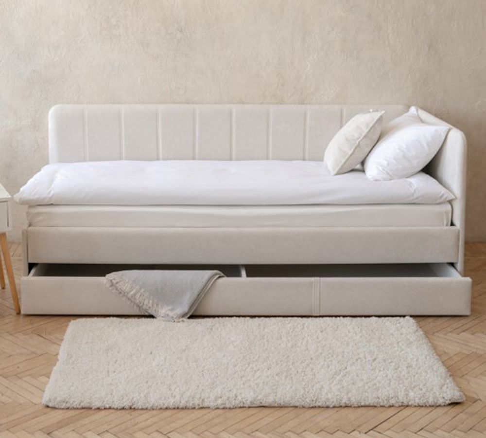 Односпальная угловая кровать COLINS 90х200 с ящиком для хранения, с мягким изголовьем, для дома, для спальни, ортопедическое основание, ламели усиленные, ящик для белья, велюр.