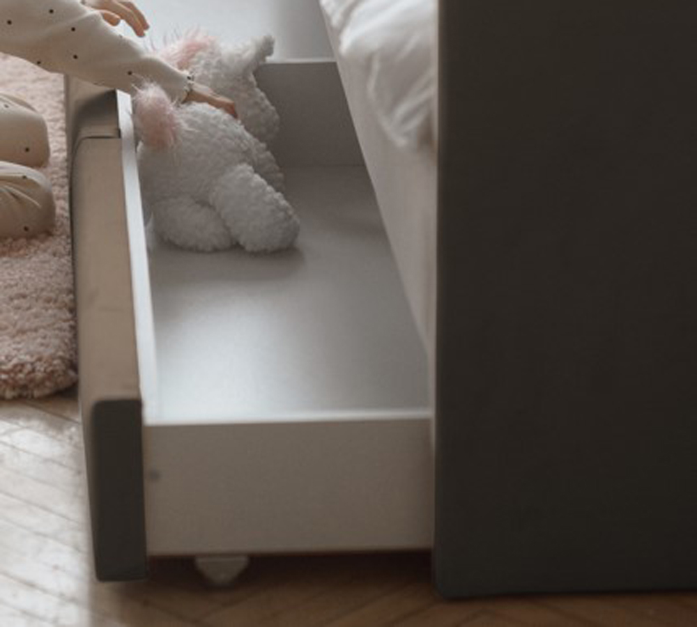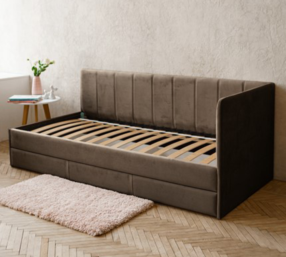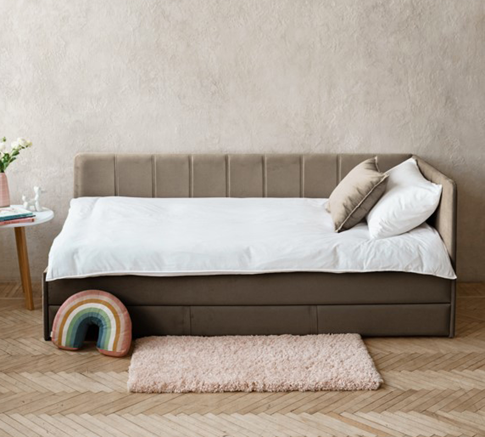 Односпальная угловая кровать COLINS 90х200 темно-бежевая с ящиком для хранения, с мягким изголовьем, для дома, для спальни, ортопедическое основание, ламели усиленные, ящик для белья, велюр.