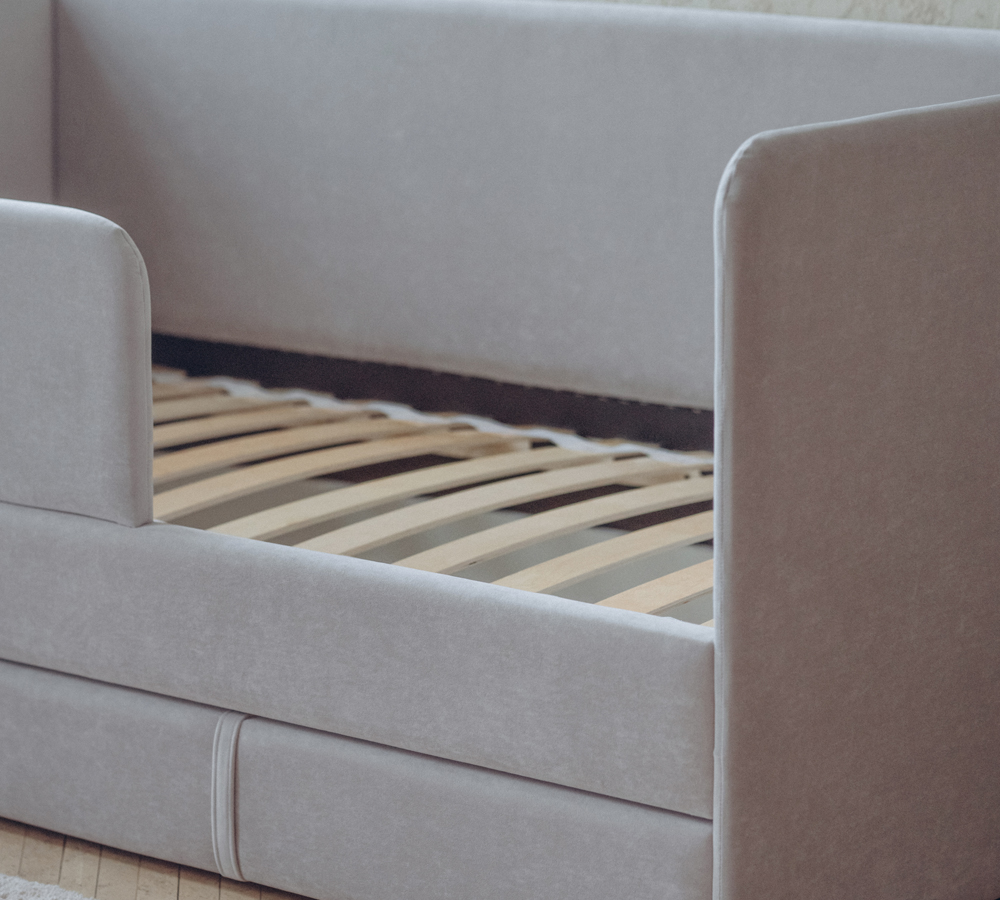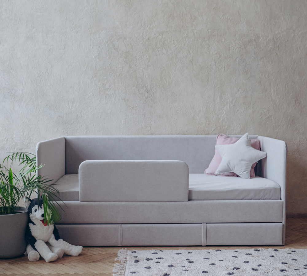 Детский диван-кровать 90*180 см DREAM светло-серый с ящиком и защитным бортиком, кровать детская от 3х лет.