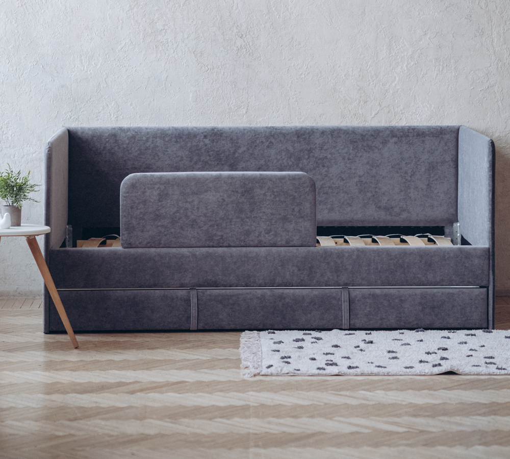 Детский диван-кровать 90*180 см DREAM темно-серый с ящиком и защитным бортиком, кровать детская от 3х лет (без матраса)