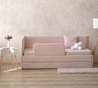 Детский диван-кровать 90*180 см DREAM line в полоску розовый с ящиком и защитным бортиком, кровать детская от 3х лет (без матраса)