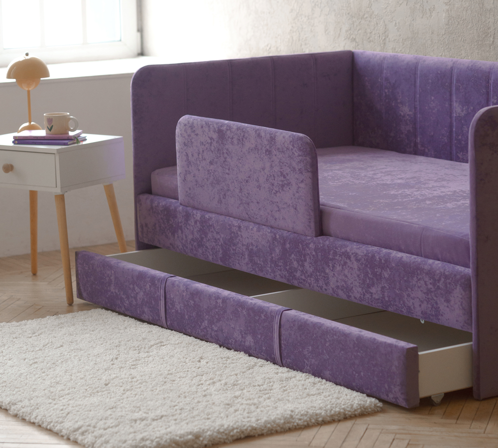 Детский диван-кровать 90*180 см DREAM line в полоску сиреневый с ящиком и защитным бортиком, кровать детская от 3х лет (без матраса)