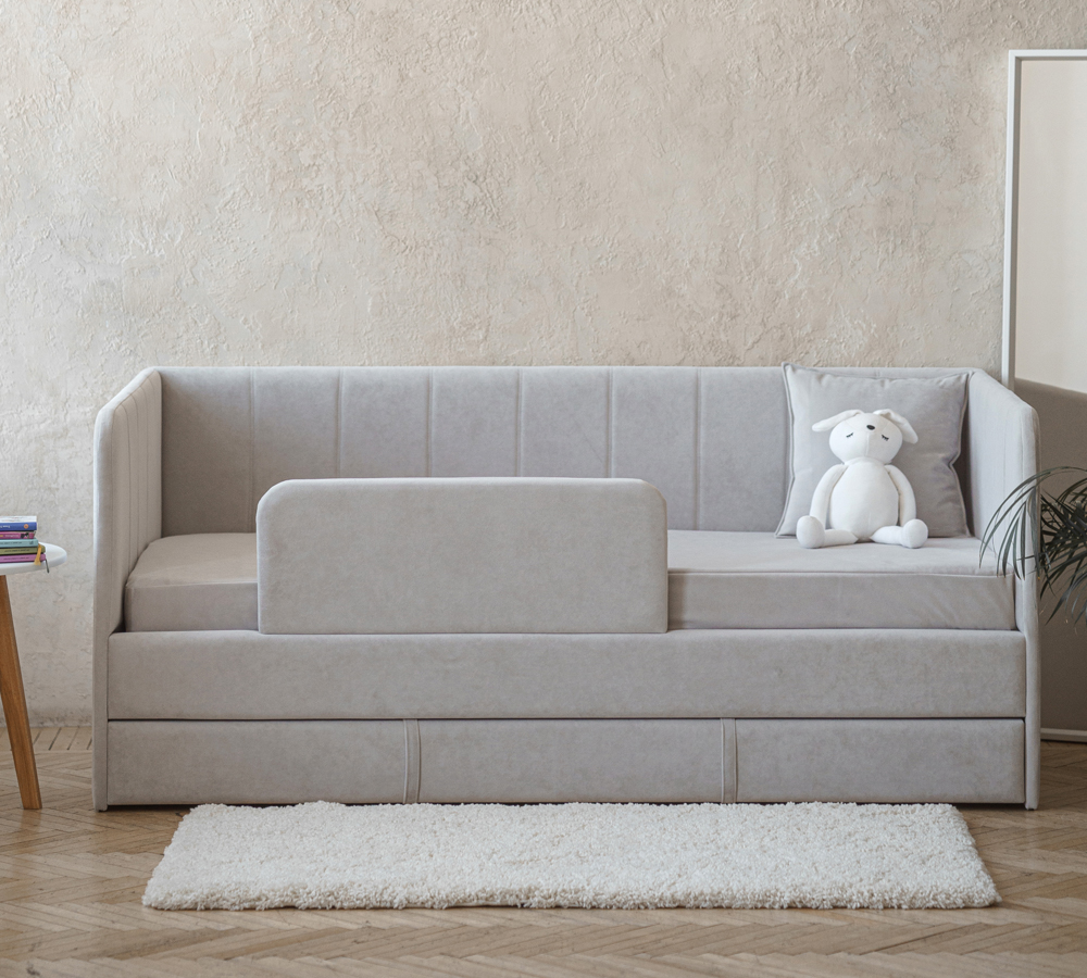 Детский диван-кровать 90*180 см DREAM line в полоску светло-серый с матрасом, чехлом, ящиком и бортиком, кровать детская от 3х лет