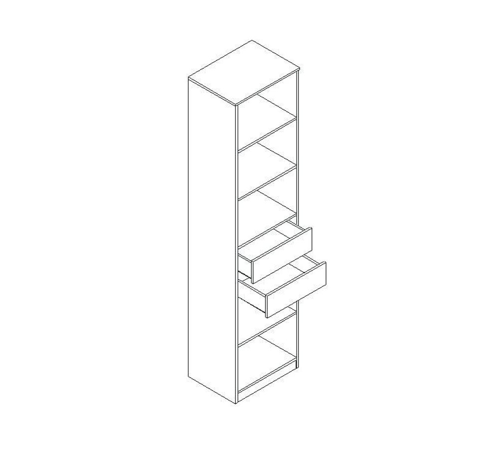 Четыре открытые полки и два выдвижных ящика на шариковых направляющих