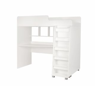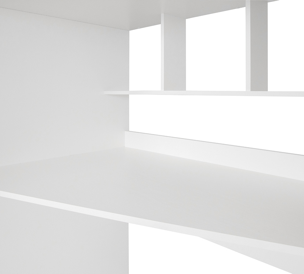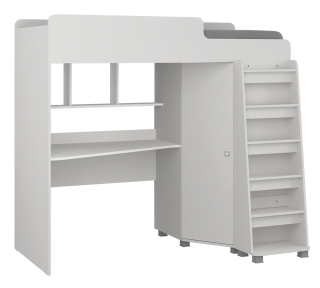 Полки и шкаф предоставляют много места для хранения игрушек и иных вещей. Все линии плавные, что не только выглядит красиво и современно, но и обеспечивает еще больше безопасности. Детская кровать, расположенная сверху, оборудована бортиками безопасности в цвет фасадов. Максимальная нагрузка на лестничную перекладину: 70 кг.
