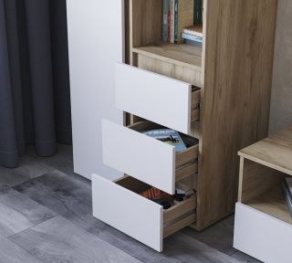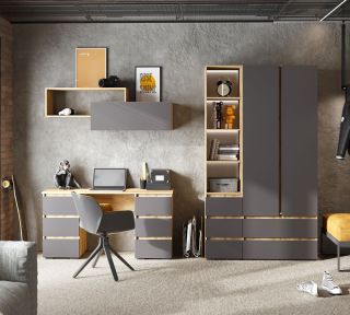 Важным акцентом является отсутствие ручек на фасадах, что создаёт лаконичность и цельность образа модулей и всей коллекции.