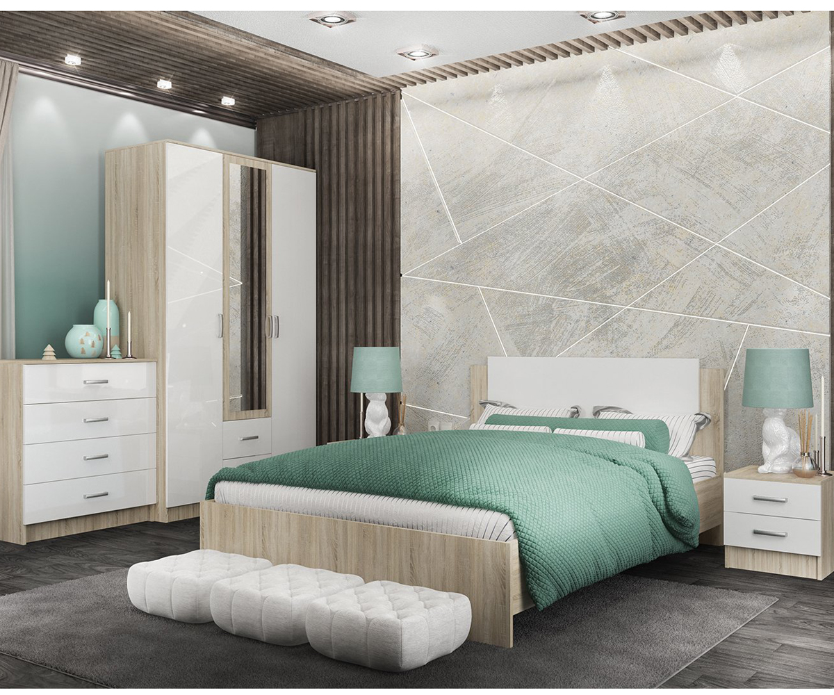 Комплект мебели для спальни №1 Софи, включает в себя кровать двуспальную (спальное место 1600*2000мм, матрас в комплект не входит), Тумба прикроватная 2шт, Шкаф 3х створчатый, комод.