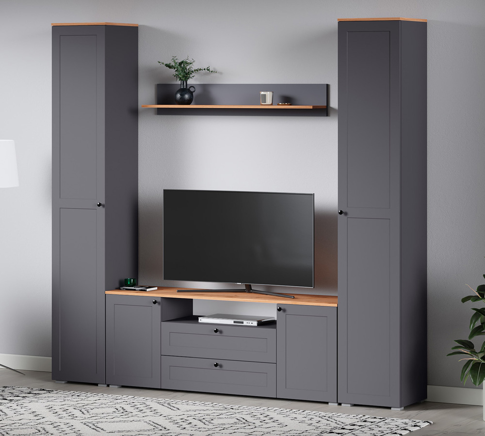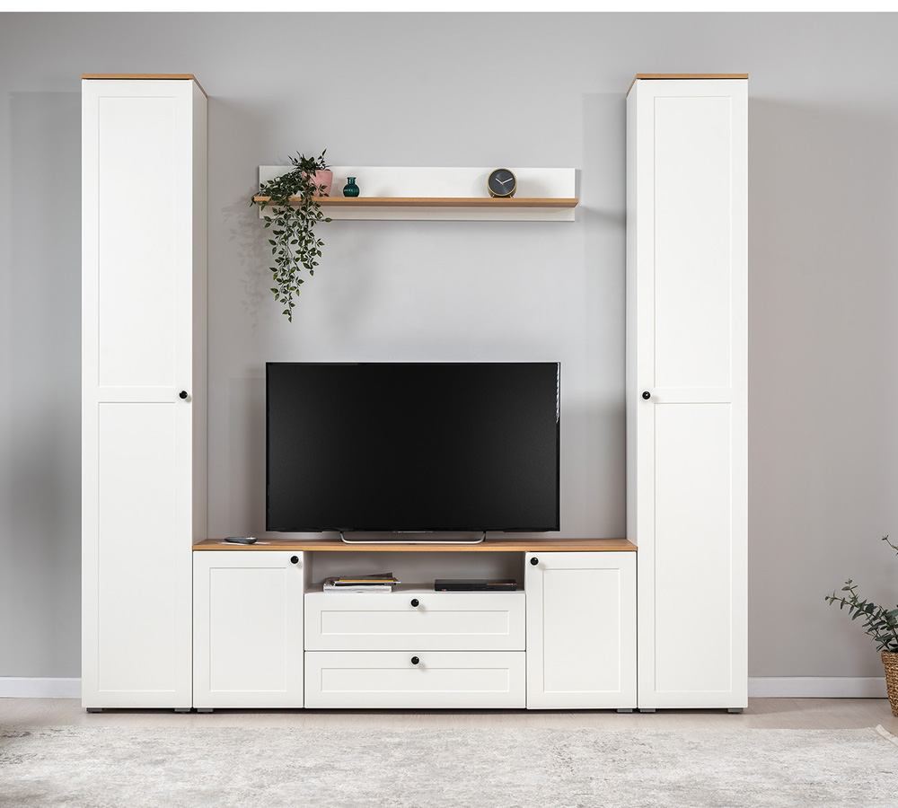 Гостиная Остин 2 - стильный и компактный гарнитур для интерьера гостиной комнаты. Конструкция с глухими распашными дверцами. Тумба обеспечит размещение большого телевизора. Исполнение в комбинированной расцветке.