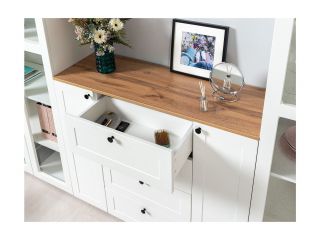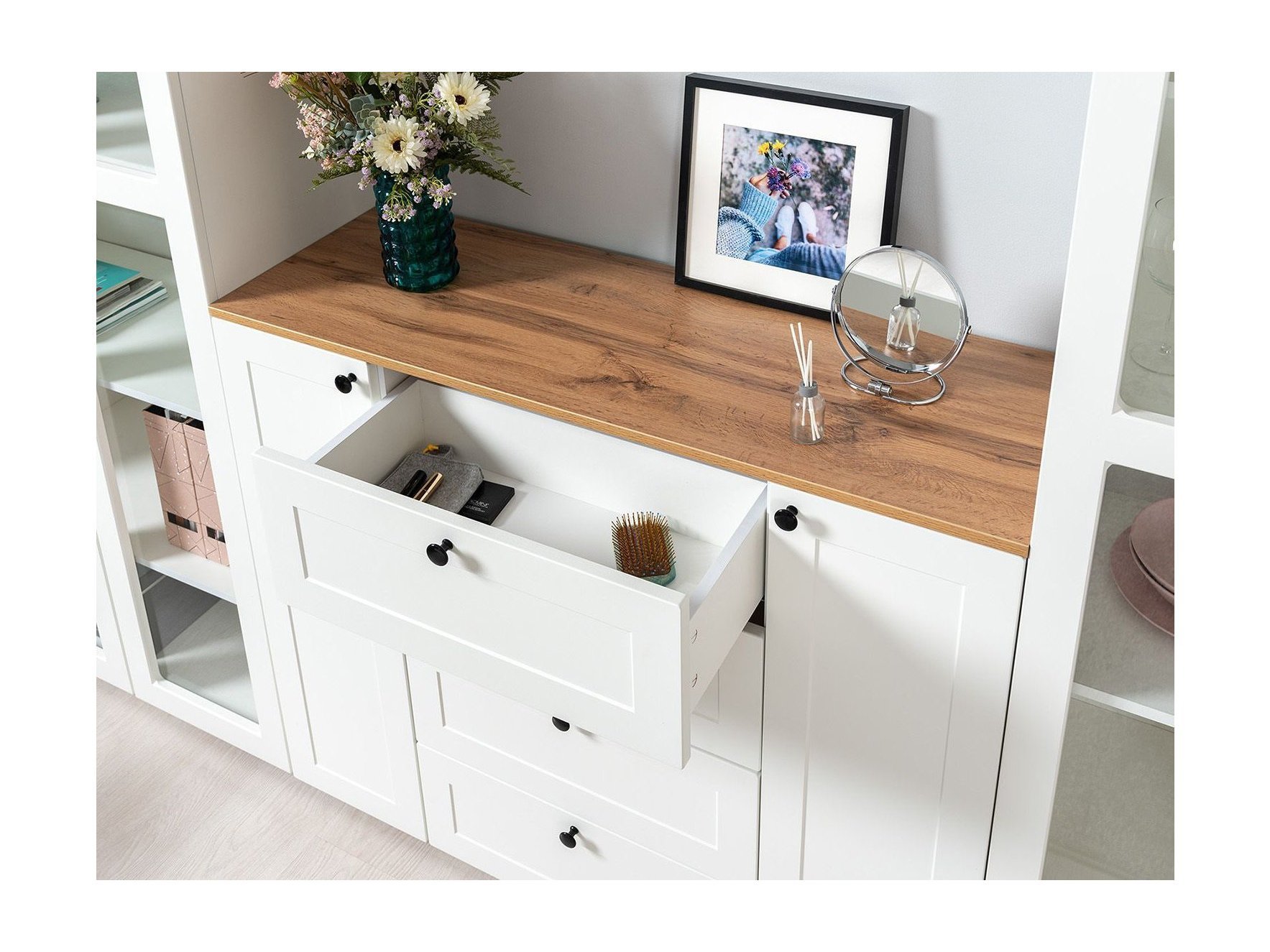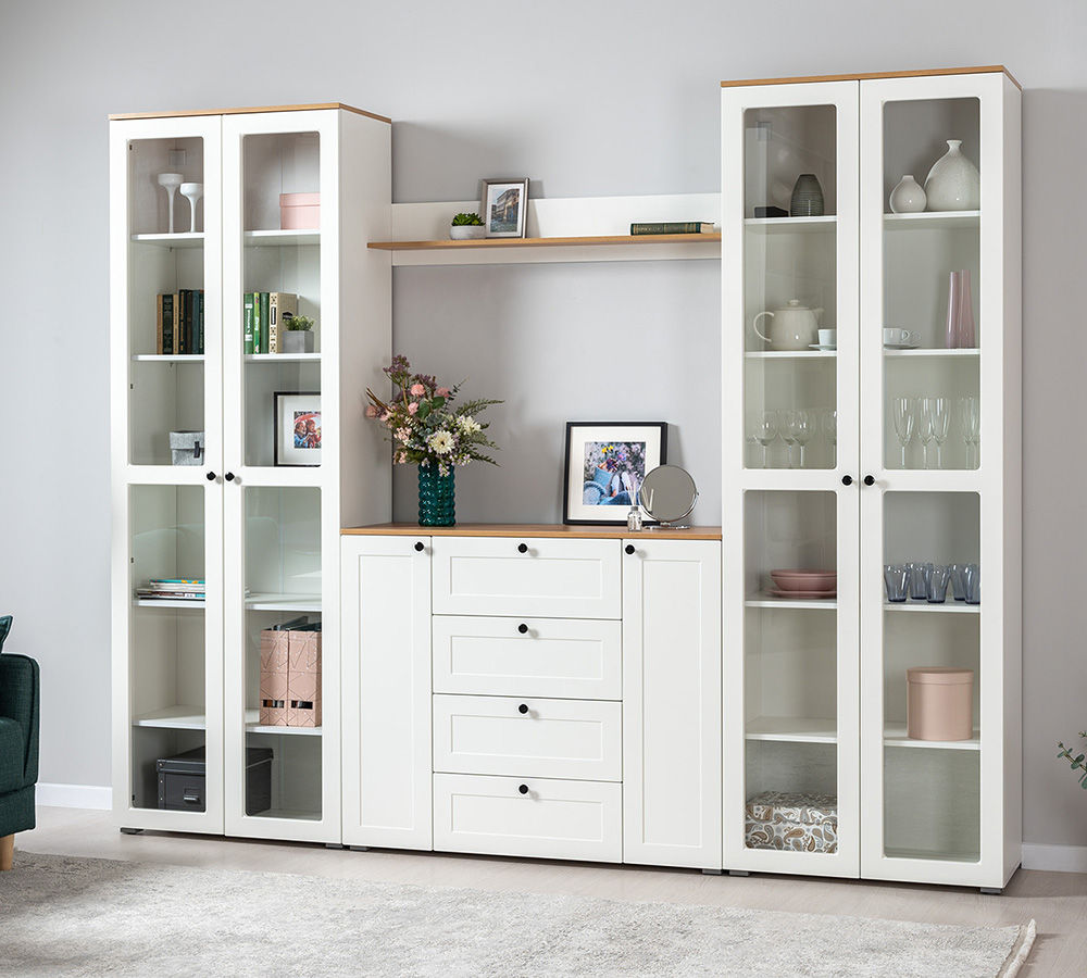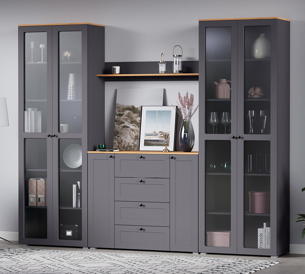 Гостиная Остин 4 - современный гарнитур для интерьера гостиной комнаты. Конструкция со стеклянными распашными дверцами. Комод обеспечит вместительное хранилище вещей и размещение большого телевизора. Исполнение в комбинированной расцветке.