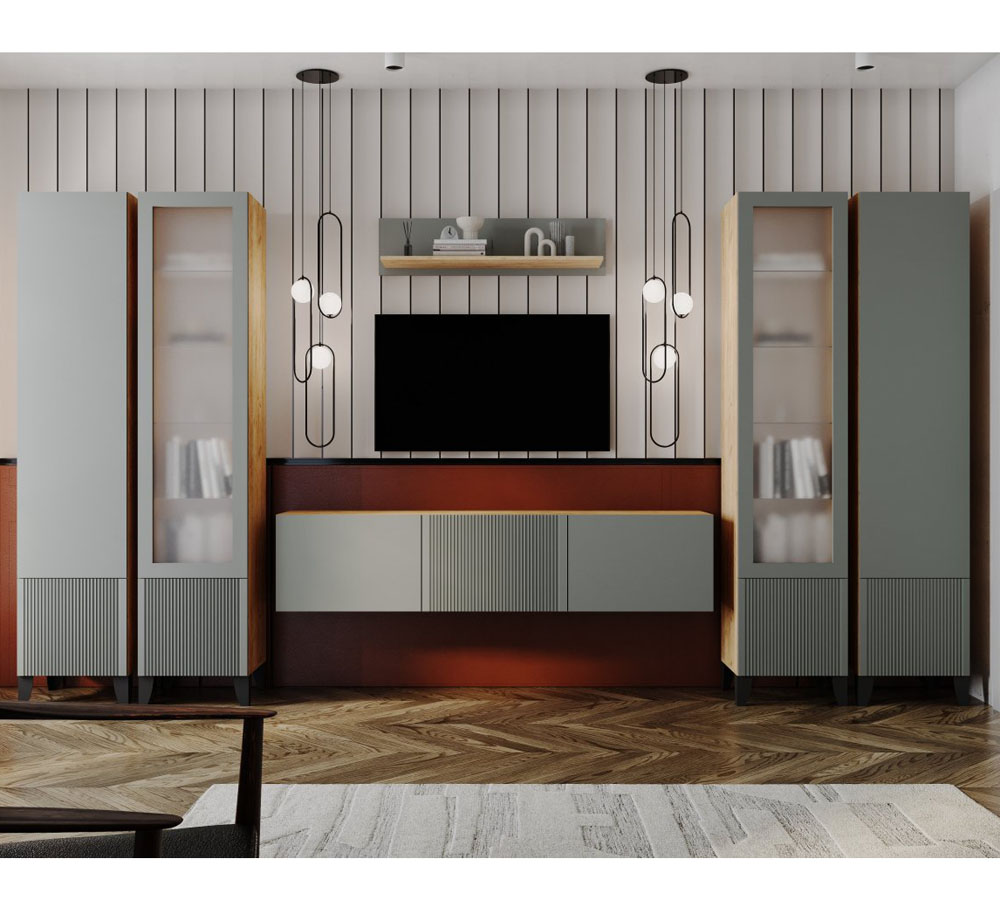 Стоимость указана за комплект: пенал 2 шт, пенал со стеклом 2 шт, тумба ТВ подвесная, полка навесная.
