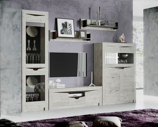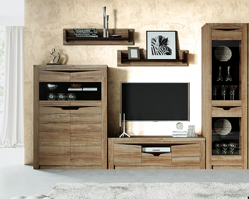 Комплектация №2 модульной системы "Соренто" Габарит: 3070х2000х385мм, включает в себя шкаф витрина 1дв, тумбу тВ длиной на 1400мм, навесной полки 2шт, шкаф тумба 2х дв.