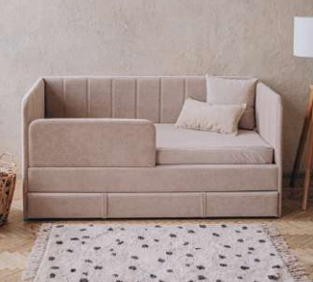 Детский диван-кровать 160*80 см Happy line в полоску бежевый с ящиком и защитным бортиком, кровать детская от 3х лет.