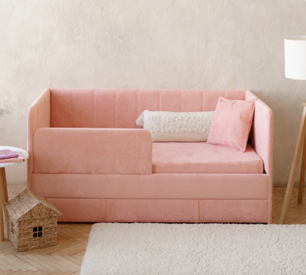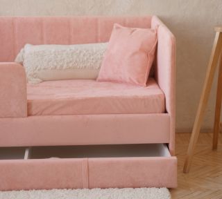 Детский диван-кровать 160*80 см Happy line в полоску коралловый с ящиком и защитным бортиком, кровать детская от 3х лет.