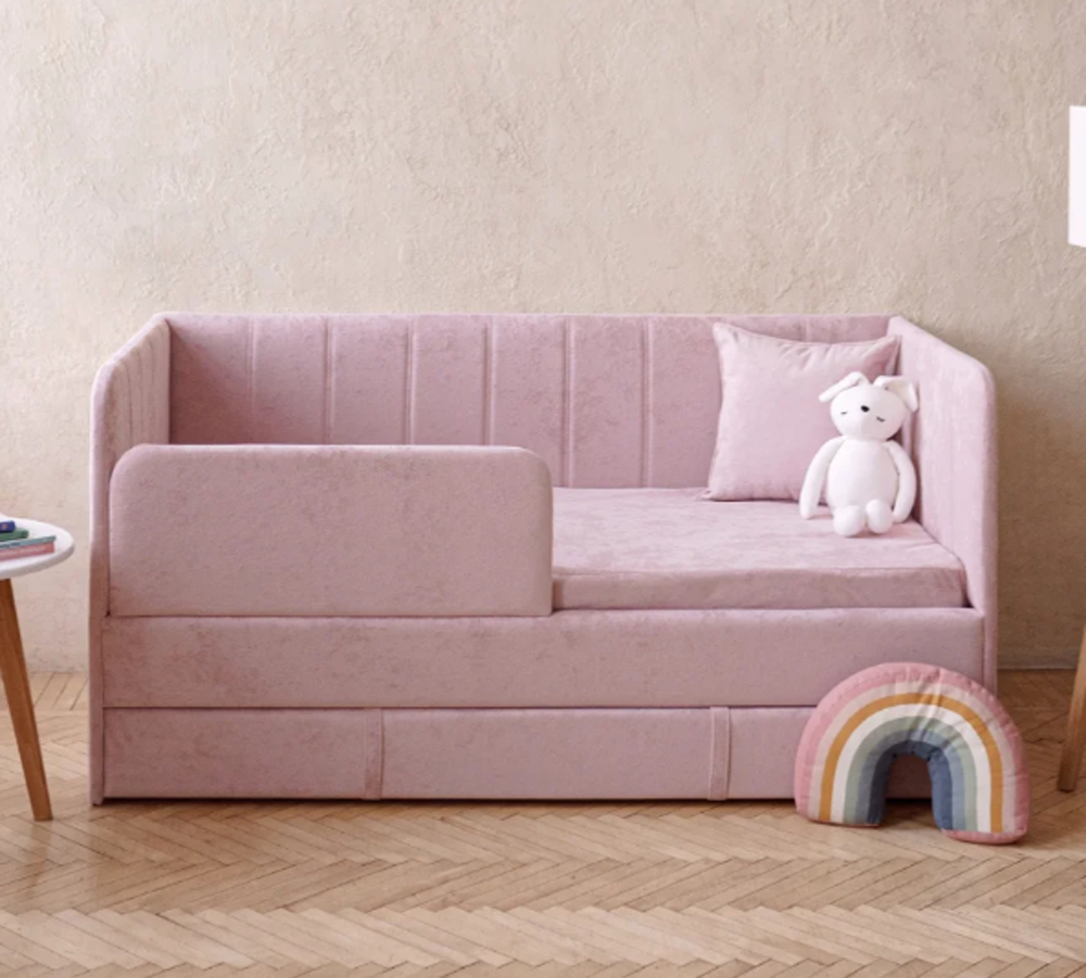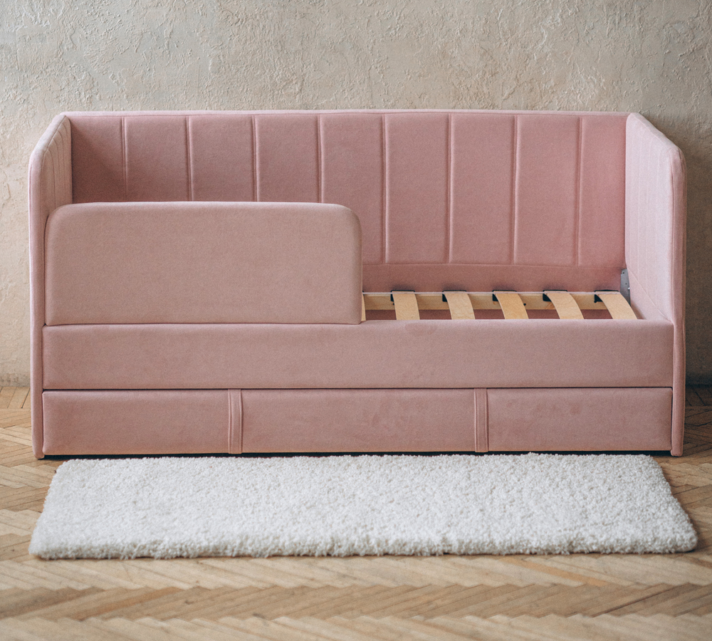 Детский диван-кровать 160*80 см Happy line в полоску розовый с ящиком и защитным бортиком, кровать детская от 3х лет.