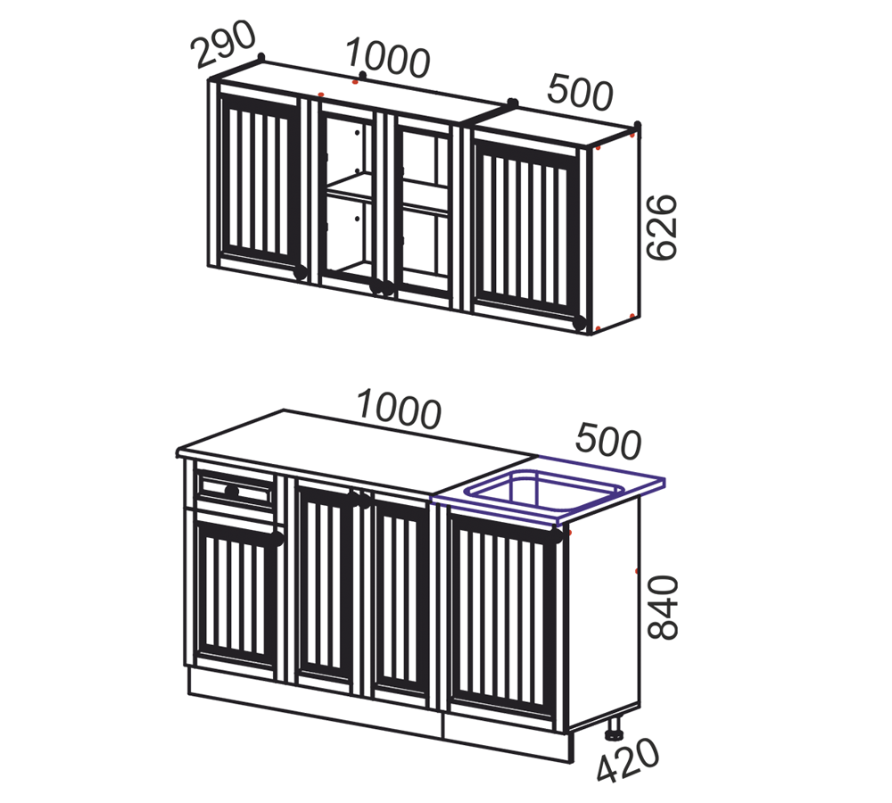 Высота кухонного гарнитура изменяется в зависимости от установки.
