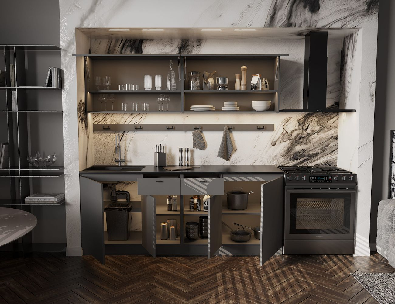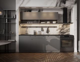 Описание Стильный и брутальный кухонный гарнитур, предназначенный для средних и больших пространств. Два верхних шкафа длиной по 1000 мм идентичны по конструктиву и представляют собой закрытую створкой секцию высотой 40 см и открытую нижнюю нишу высотой 20 см. Открытие створки на газлифтах осуществляется за выступающий ниже промежуточной вязки фасад. Огромное закрытое пространство верхних шкафов предназначено для хранения посуды, продуктов, банок и прочей кухонной утвари. Нижние ниши шкафов, дающие возможность хранить в открытом быстром доступе необходимую посуду, чашки, специи и прочее. КГ Энии 2,0 в своем конструктиве имеет две планки партнеры для монтажа на рабочую стену с наметкой на обратной стороне . Ключевая функция планок - наличие шести двухрожковых крючков. Теперь перед Вами не будет стоять вопрос, где разместить полотенца, ножницы, прихватки и все то, что ежедневно требуется на кухне и должно находиться в ближайшем доступе. Отсутствие наличной фурнитуры и возможность легкого открытия створок соответствует современному минималистичному направлению интерьерной моды. Два нижних стола КГ Энни 2,0 по фасадной группе идентичны. Каждый из них оснащен распашной створкой шириной 600 мм и сочетанием выкатного ящика и распашной створки шириной 400 мм. При этом внутренний конструктив столов различен. В одном из них предусмотрен отсек под мойку шириной 600 мм и отсутствует задняя стенка для удобства монтажа коммуникаций. Вторая распашная створка шириной 600 мм открывает полочное пространство. Малые распашные створки на 400 мм так же скрывают полочное пространство. Разделочные столы, имеющие универсальную сборку, позволяют ящики и мойку разместить в удобном месте. Фасады стола открываются с помощью минималистичных черных ручек, установленных в край распашных створок и по центру выкатных ящиков. Такое расположение наличной фурнитуры облегчает распахивание и выкатывание, так как имеет максимальный рычаг движения. Кухонный гарнитур Энни 2,0 покрыт цельной черной столешницей толщиной 26мм. Габариты модулей низ (со столешницей) 2000х848х600мм; верх — 2000х600х296мм Ручки: ABS пластик, Черный матовый Направляющие: роликовые, ABS пластик, Белый Петли: Петли четырехшарнирные, сталь, Хром Газлифт: Сталь, Хром Подвесы: Сталь, Хром Столешница: Влагостойкий ДСП 26 мм, Черный матовый Крючки вешалки и ключницы: ABS пластик, Черный матовый