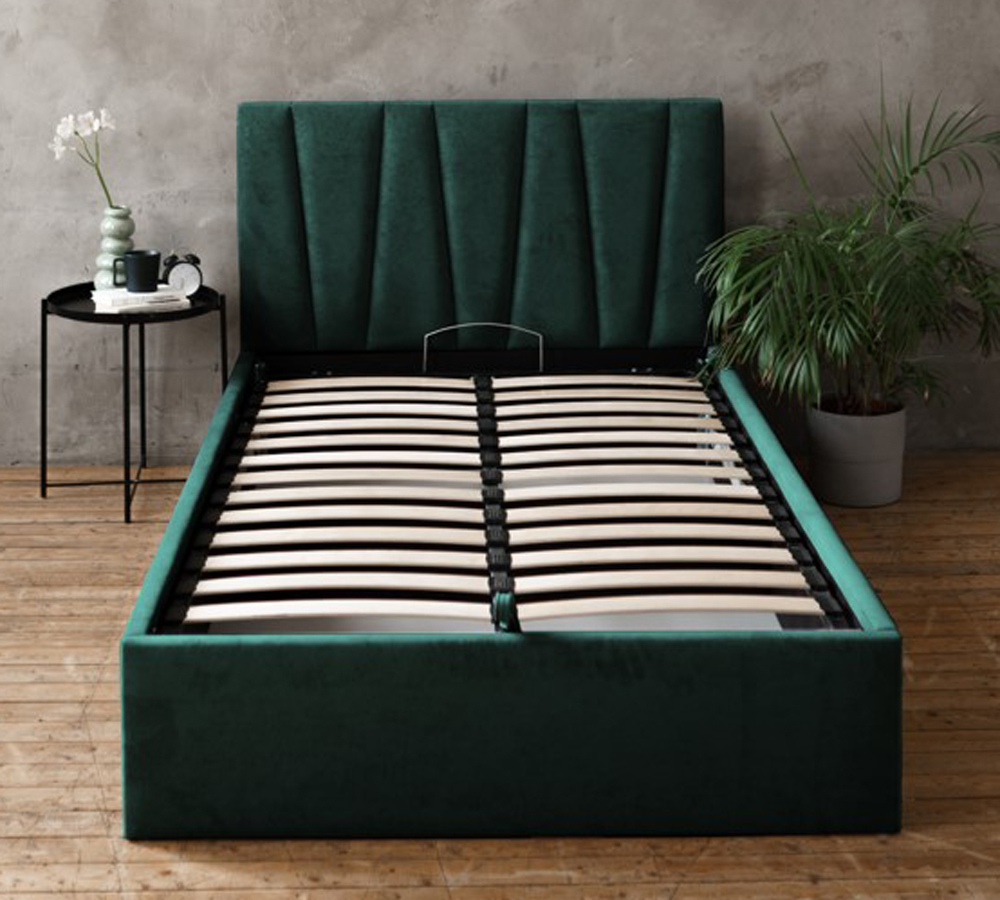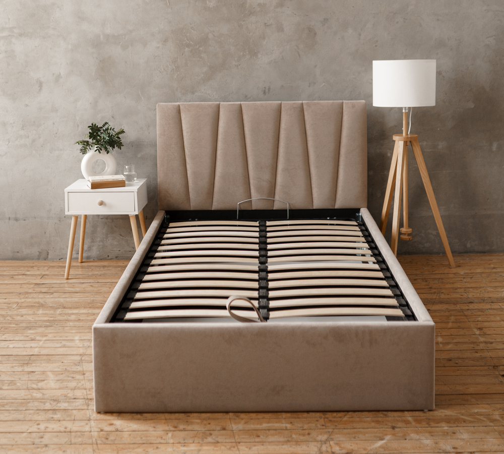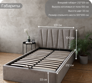 Односпальная кровать KELLY 120х200 серая с подъемным механизмом двуспальная, с мягким изголовьем для дома, для спальни, ортопедическое основание, ламели усиленные, ящик для белья, велюр.