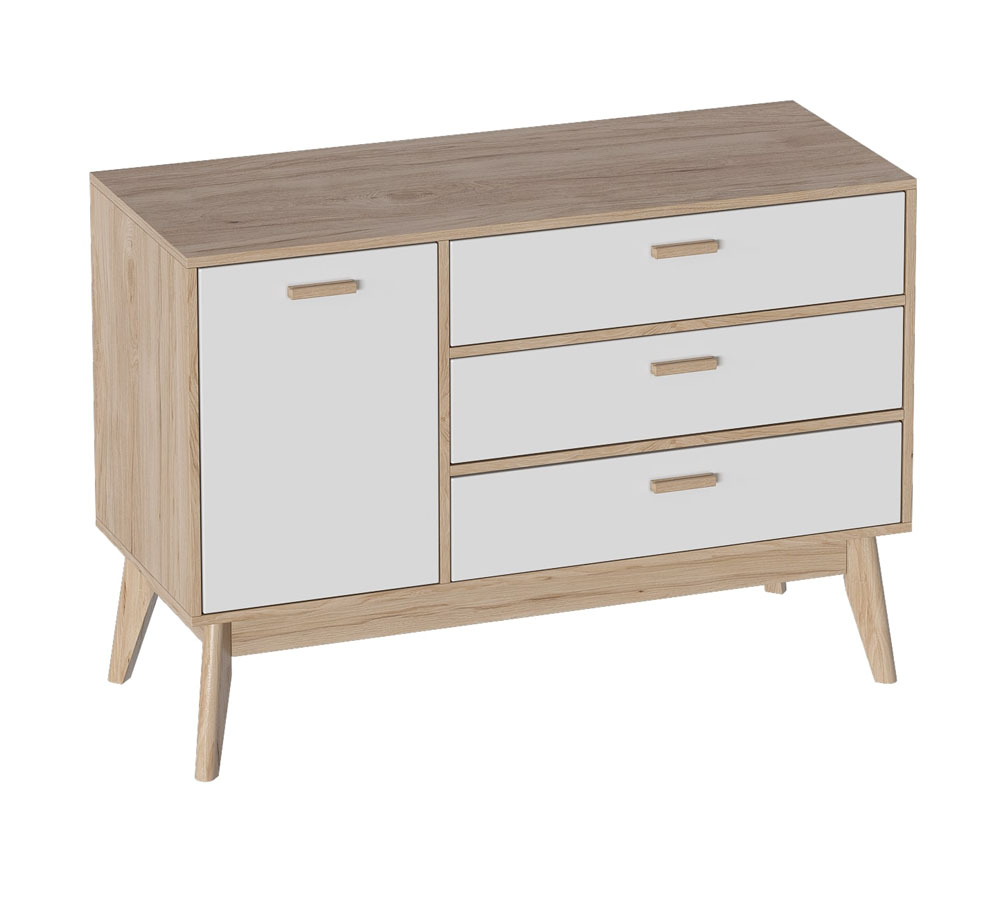Привлекающий внимание легкостью и комфортом в использовании, комод Калгари не только украсит Ваш любимый скандинавский интерьер, но и порадует Вас своей функциональностью. Каркас комода изготовлен из ЛДСП в цвет натурального дуба, фасады ящиков – из МДФ белого матового цвета, стильные, крепкие и устойчивые ножки - из массива березы.