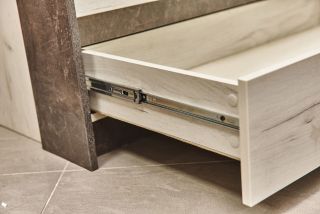 Кромка 2 мм (открытые торцы деталей) Металлические ручки и крючки Эко ЛДСП Задний щит (ДВП) в цвет корпуса Крепежный элемент - эксцентриковая стяжка Петли с доводчиком Полновыкатные направляющие