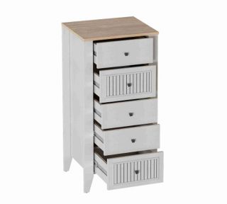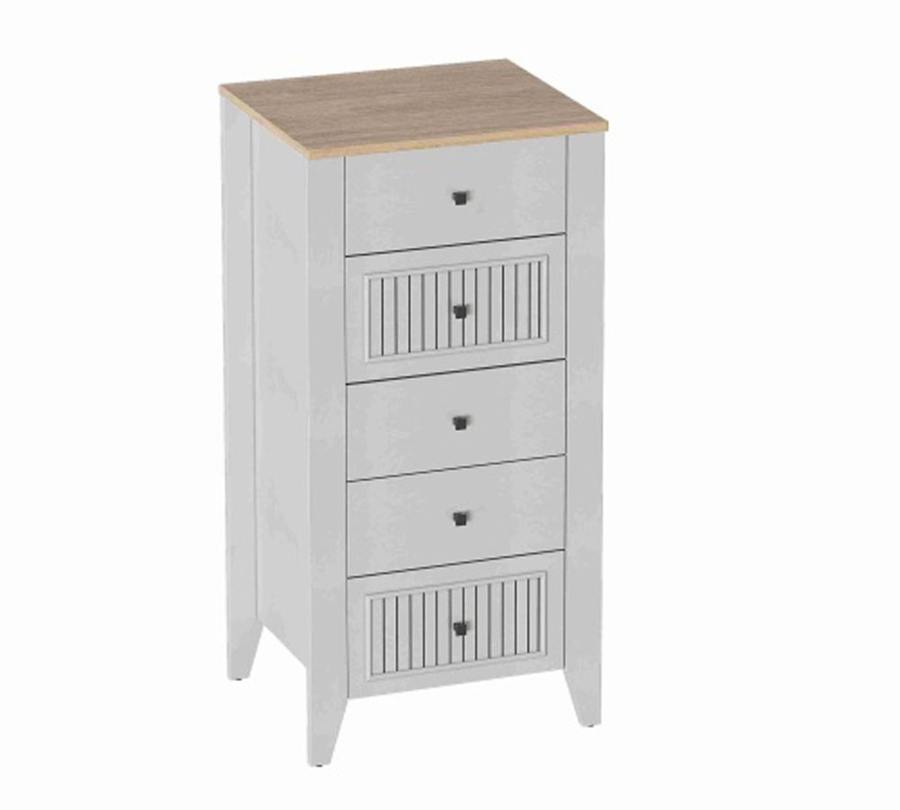 Комод с 5 ящиками Валенсия выполнен из (ЛДСП) в комбинации Дуб натуральный светлый / Персидский жемчуг.
