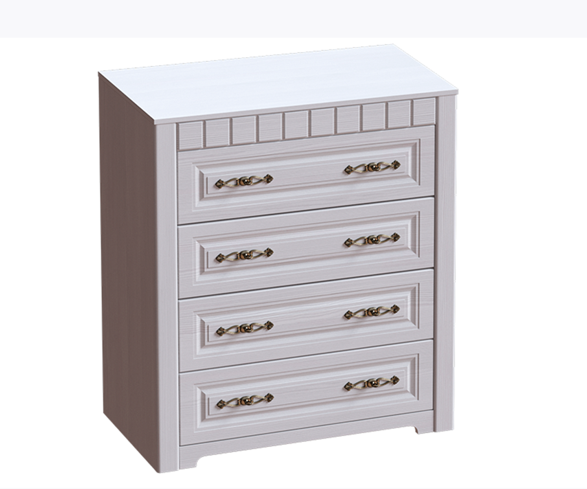 Комод с элегантным резным профилем - четыре выдвижных ящика на шариковых направляющих глубиной 35 см, металлическими ручками цвета состаренного золота.