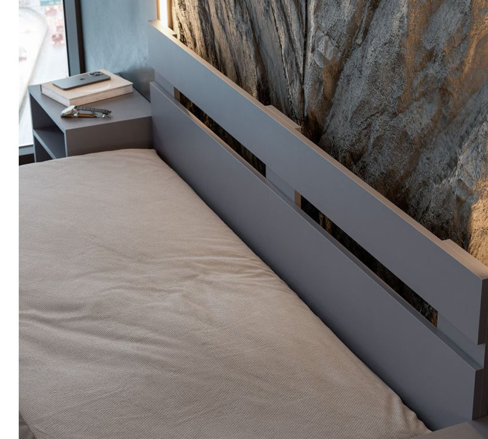 Решетчатое изголовье и нижний щиток, гарантирующие особую прочность и устойчивость. Жесткость этих визуально легких конструкций достигается вертикальными и горизонтальными вязками под основанием кроватей, вертикальными и горизонтальными опорами щитков.