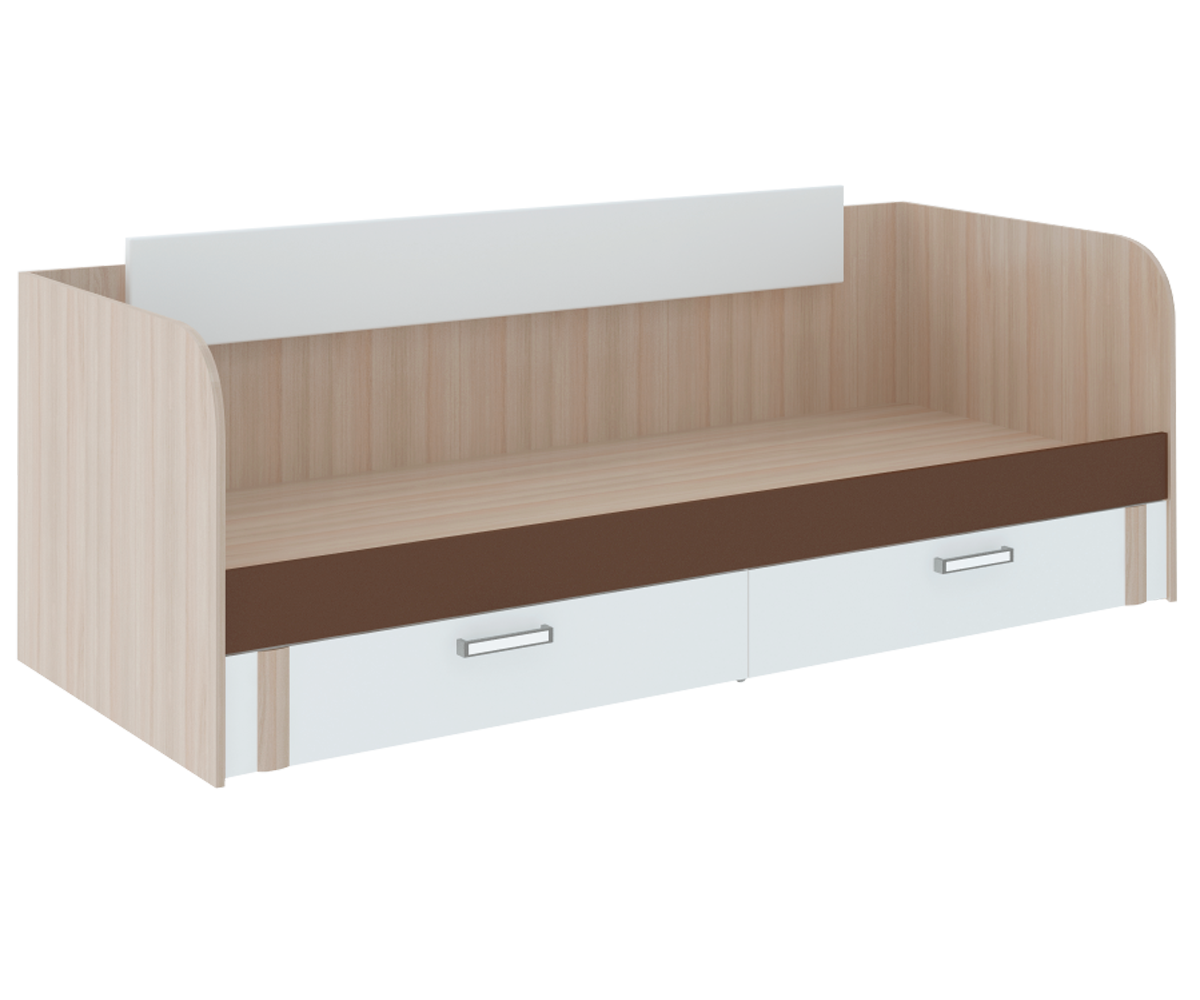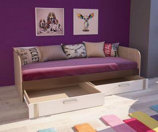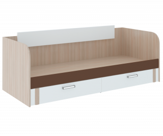 Особенности изделия: Декоративная накладка МДФ приклеивается на фасады на производстве. Кровать имеет 2 выдвижных ящика. Ящики на направляющих полного выдвижения. Изголовье из матовой экокожи Galaxy New White. Боковины с закругленными углами, что предотвращает случайные травмы. Основание кровати - плита ЛДСП. Кровать отлично компонуется с двумя навесными полками: М10 и М11, которые по суммарной ширине совпадают с шириной кровати.