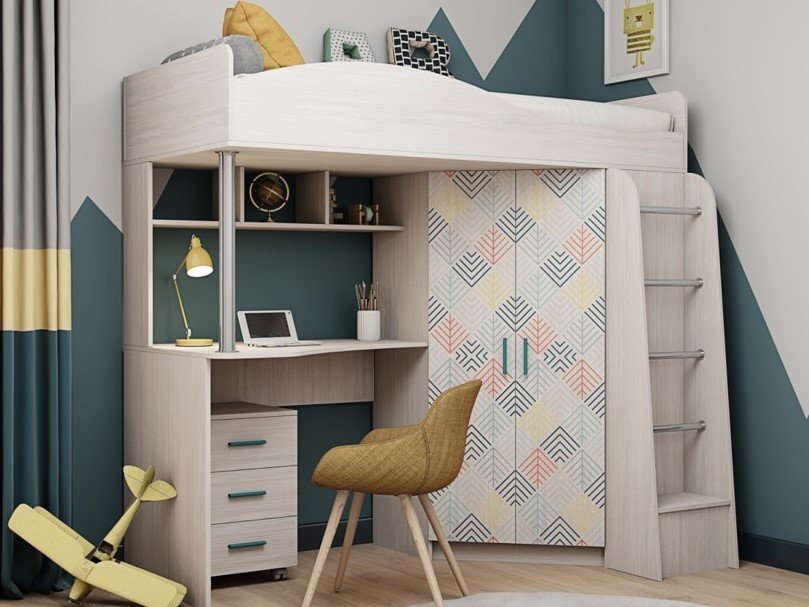 Каприз-1 кровать-чердак с угловым шкафом. Наполнение шкафа: полки+штанга (выкатная тумба заказывается дополнительно). Цвет: Анкор белый с рисунком «ёлочки». Габаритные размеры:1840х1695х1102мм. Спальное место: 1800х800мм. Угловой шкаф:840х1390х840мм. Стол:1000х750х750мм. Лестница, боковины и царги кровати, а также столешница закромлены кромкой ПВХ 2мм. Вариант исполнения: Можно собрать на другую сторону.