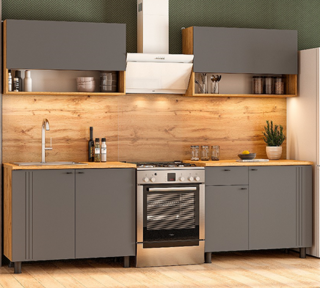 Фасады верхних модулей не имеют ручек, открытие за нижний край фасада.