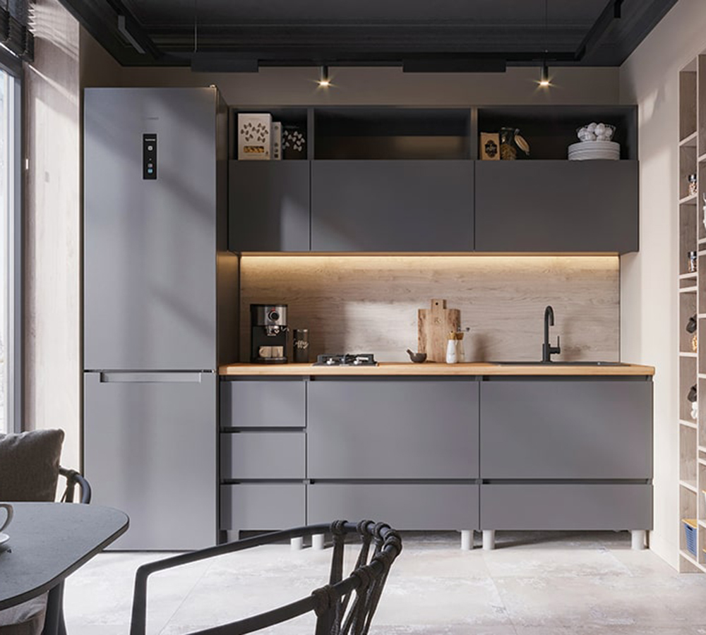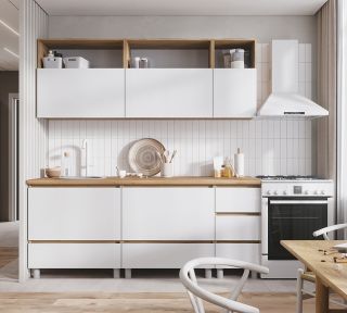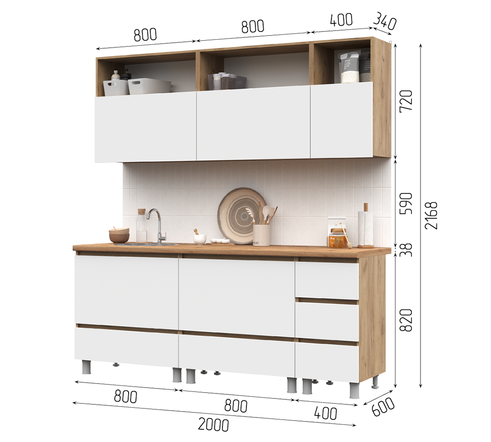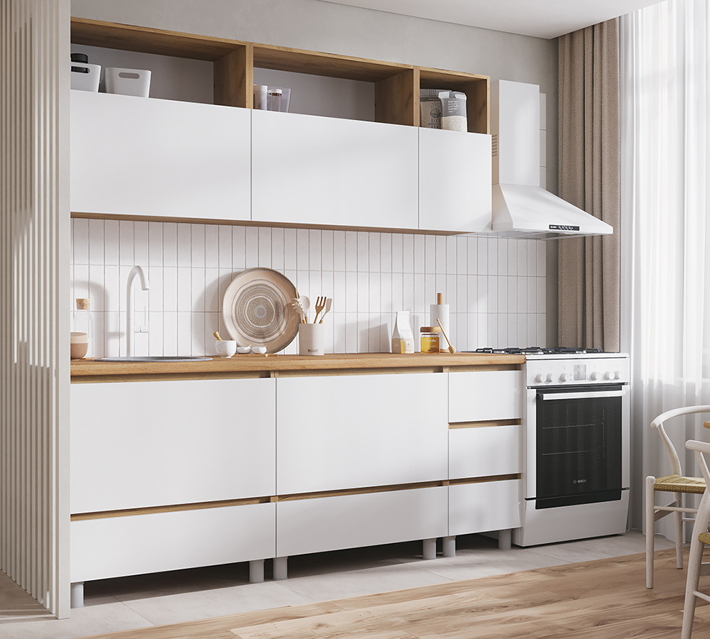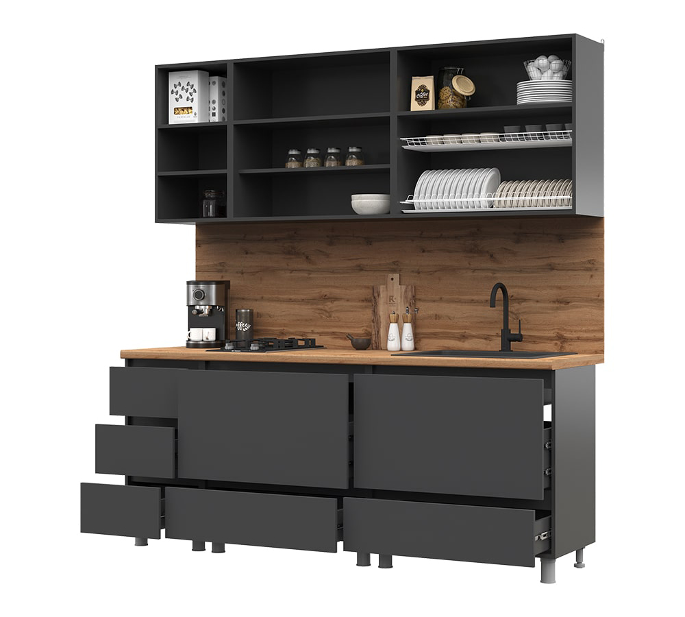В комплект не входят: бытовая техника, мойка, посудосушитель, смеситель и стеновая панель. Они приобретаются отдельно.