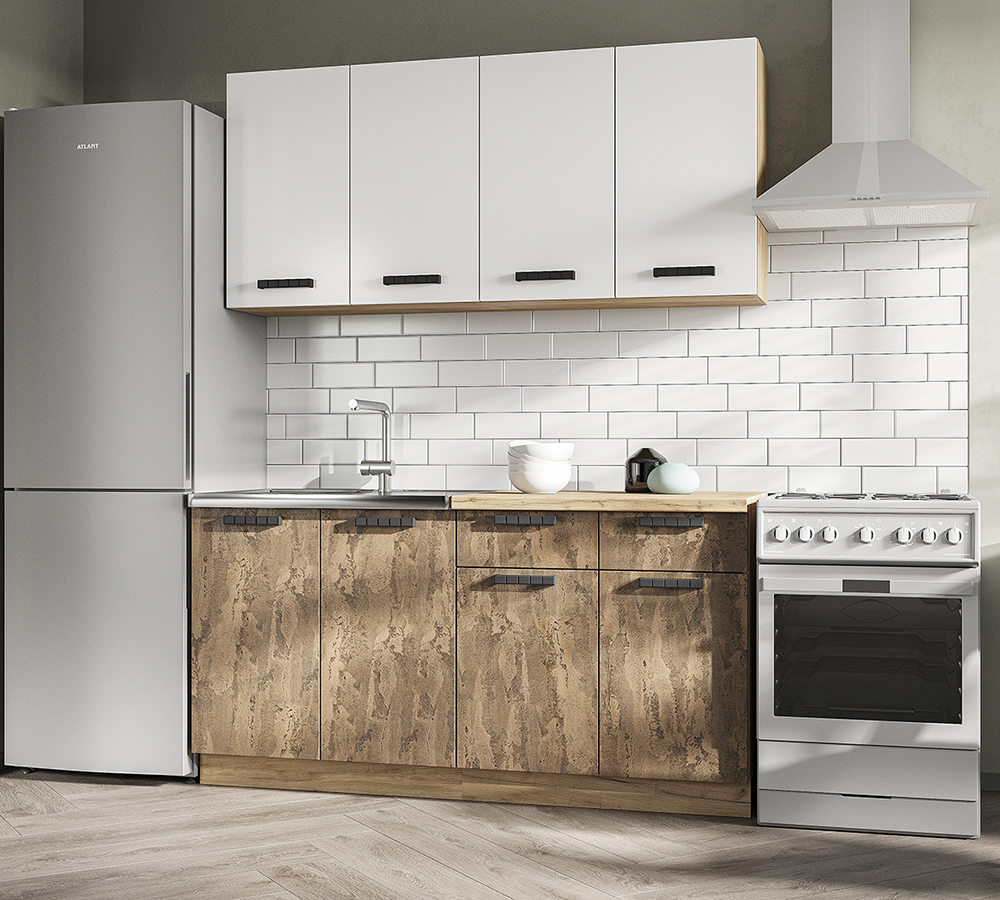 В комплект не входят: бытовая техника, мойка, посудосушитель, смеситель и стеновая панель. Они приобретаются отдельно.