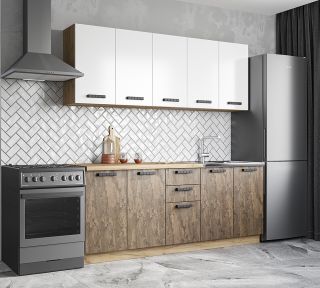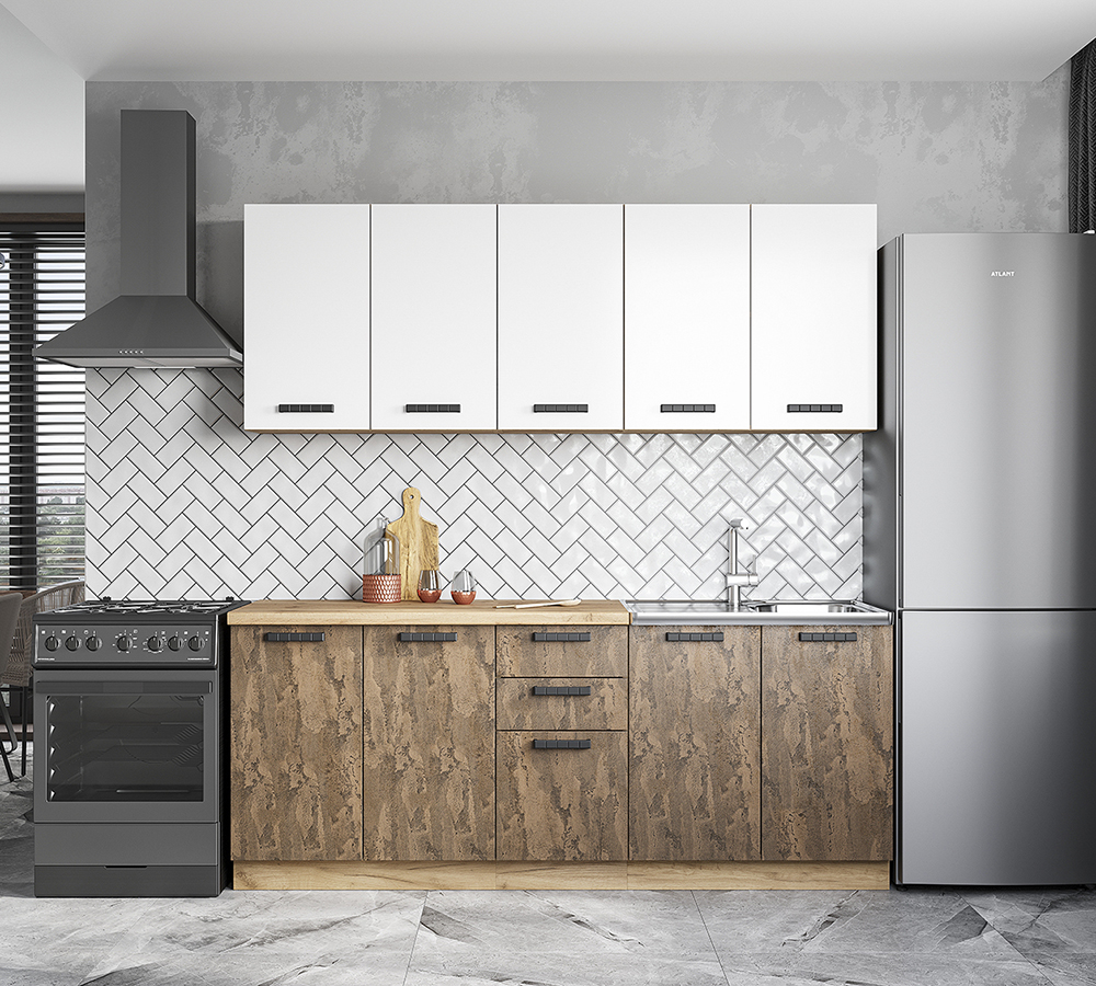 В комплект не входят: бытовая техника, мойка, посудосушитель, смеситель и стеновая панель. Они приобретаются отдельно.