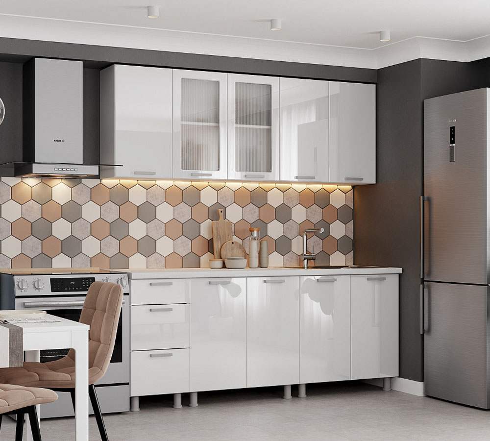 высота столов с учетом ножек - 824 мм, глубина модулей по столешнице — 600мм. - Верхние модули: глубина шкафов с учетом фасадов - 296 мм, высота навесных шкафов -720 мм !!! Материалы: - ЛДСП «Белый». - Фасад: Белый глянец