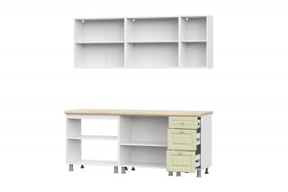 высота столов с учетом ножек - 824 мм, глубина модулей по столешнице — 600мм. - Верхние модули: глубина шкафов с учетом фасадов - 296 мм, высота навесных шкафов -720 мм !!! Материалы: - ЛДСП «Белый». - Фасад: МДФ Фисташковый ; Белый текстурный