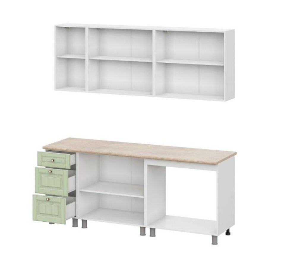 Цвет: верх фасад Фисташковый структурный, низ фасад Фисташковый структурный, столешница Дуб Сонома 26мм, каркас Белый.