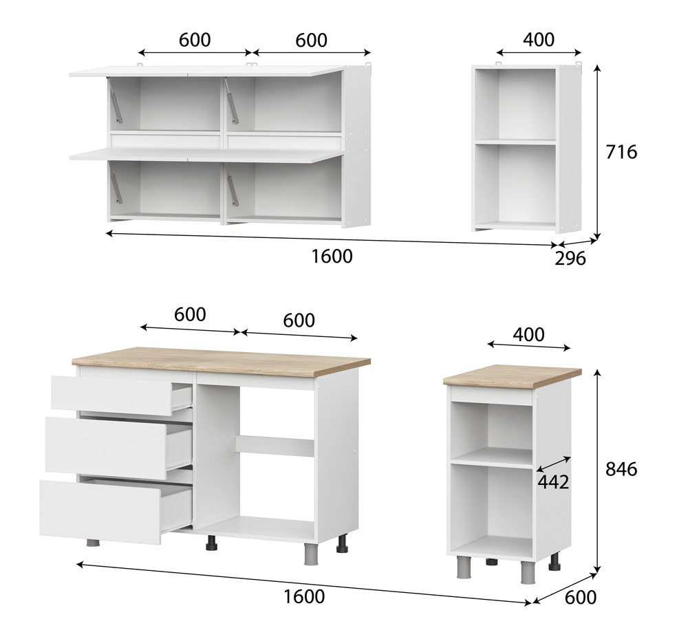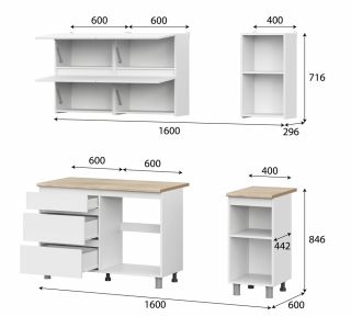 Габариты модулей низ (ШхВхГ) - 1600х820х442мм (без столриты ящиков (ШхВхГ) -