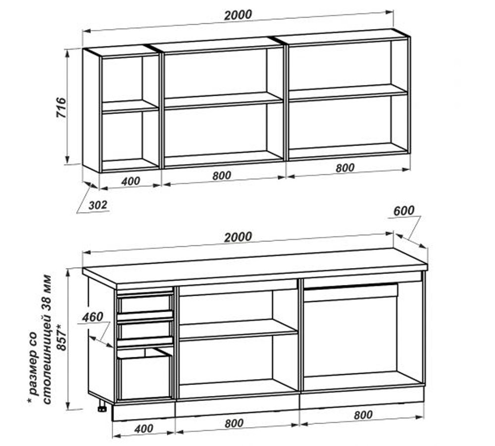 Все кухни комплектуются цельной столешницей( 38мм) в размер кухни и входит в стоимость
