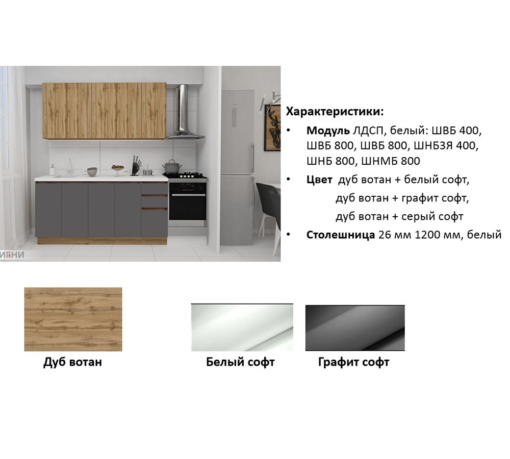 Нижние модули: высота - 820 мм (без столешницы), глубина - 460 мм Материал: корпус - ЛДСП дуб вотан,