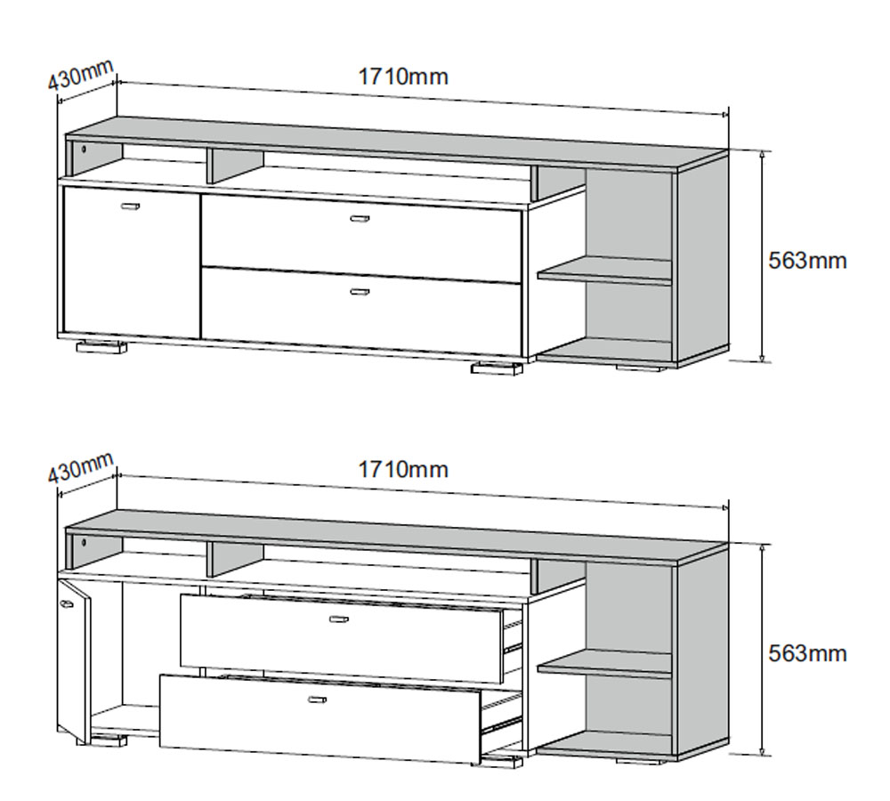 По всей длине находится ниша с верхней крышкой, её стенки выполнены из материала ЛДСП цвет Бунратти, которую видно целиком, Справа от фасада расположены два выдвижных ящика с внутренней перегородкой, глубиной 400 мм, высота зоны хранения 100мм; Справа открытое пространство с полкой, материал деталей ЛДСП цвет БУНРАТТИ