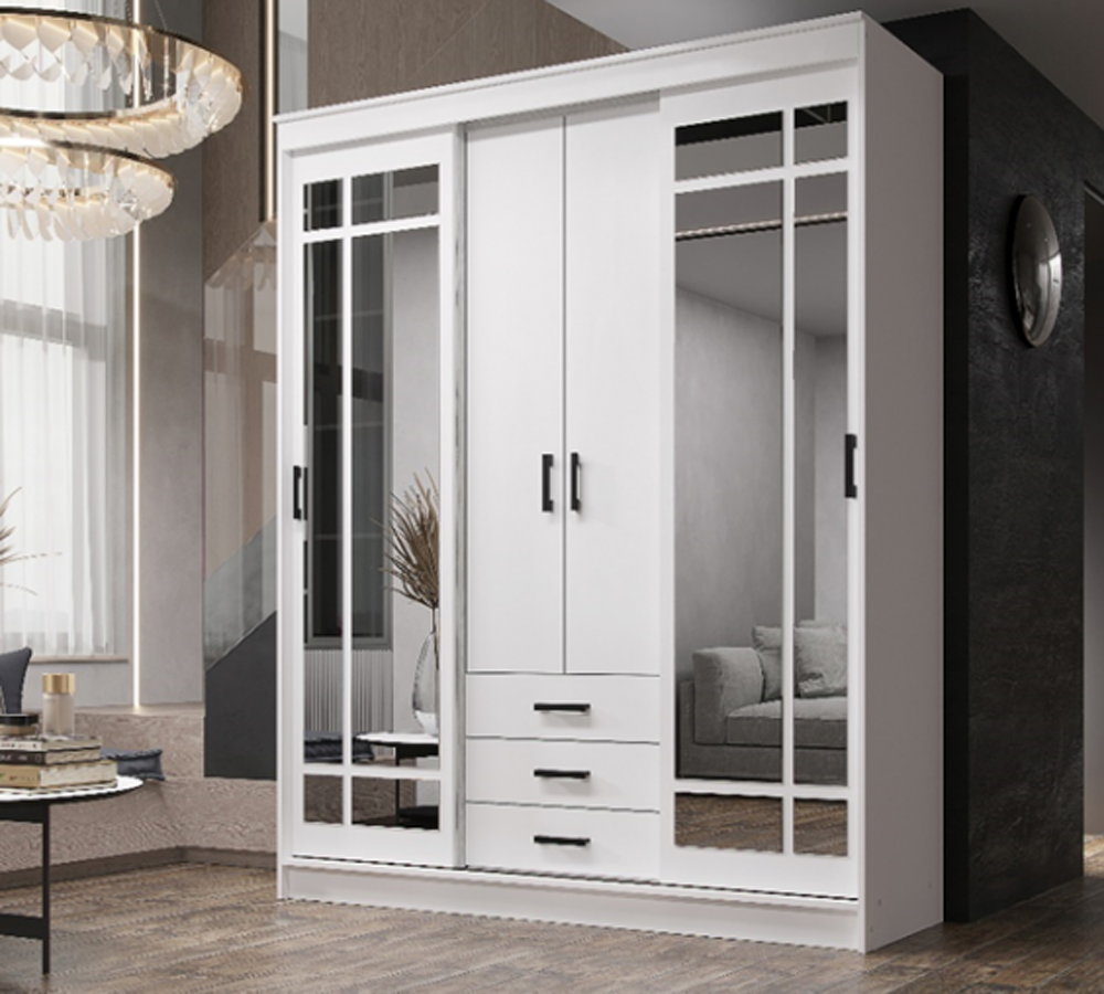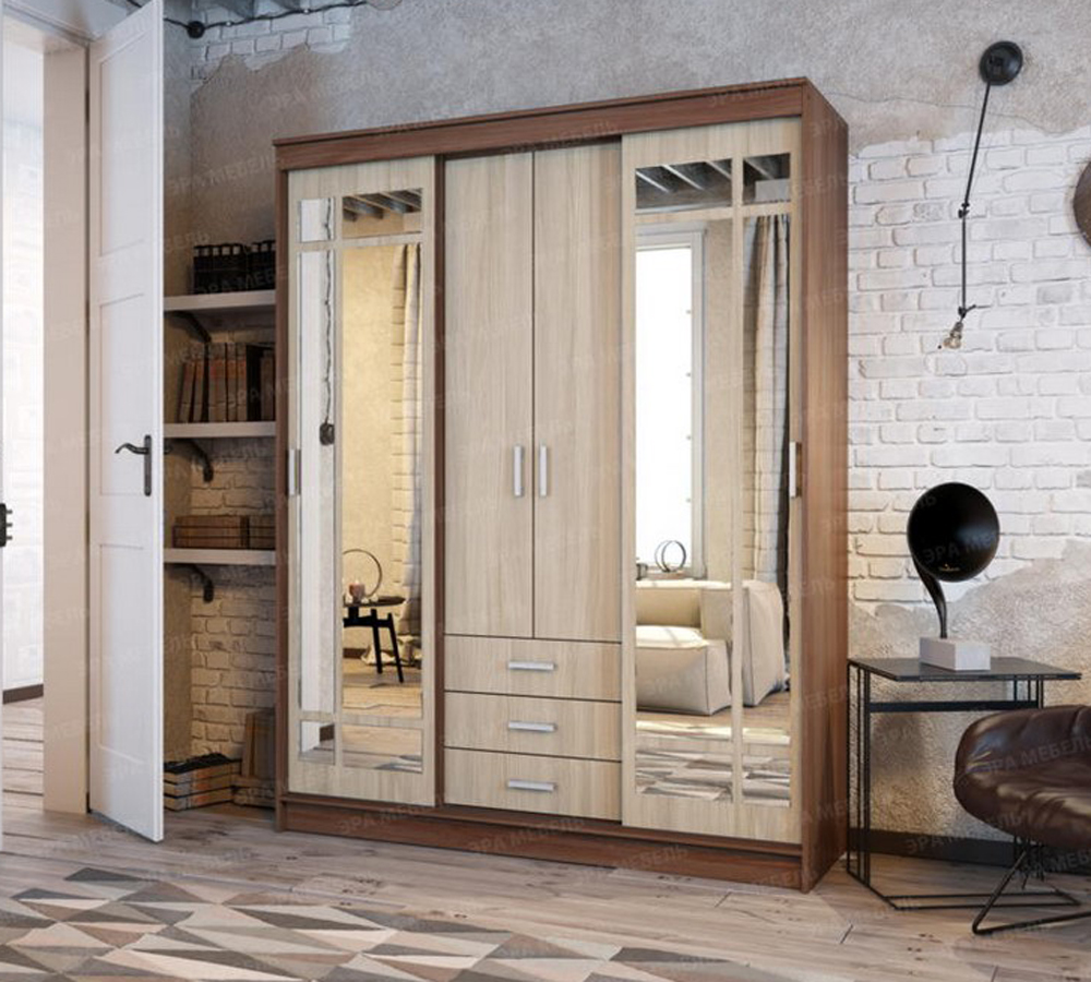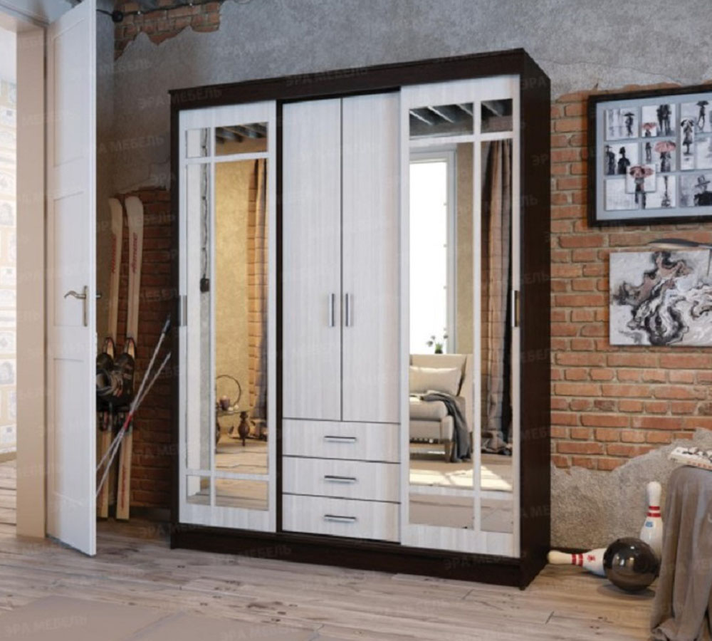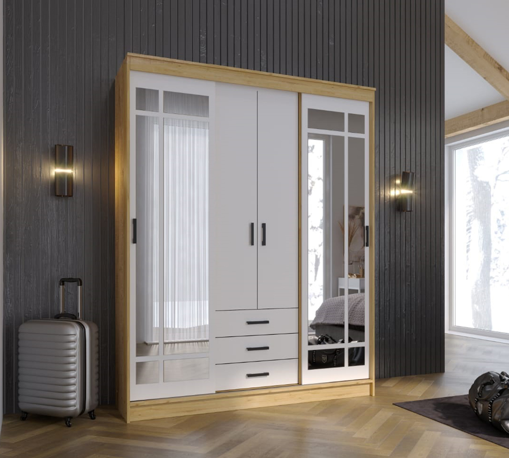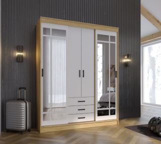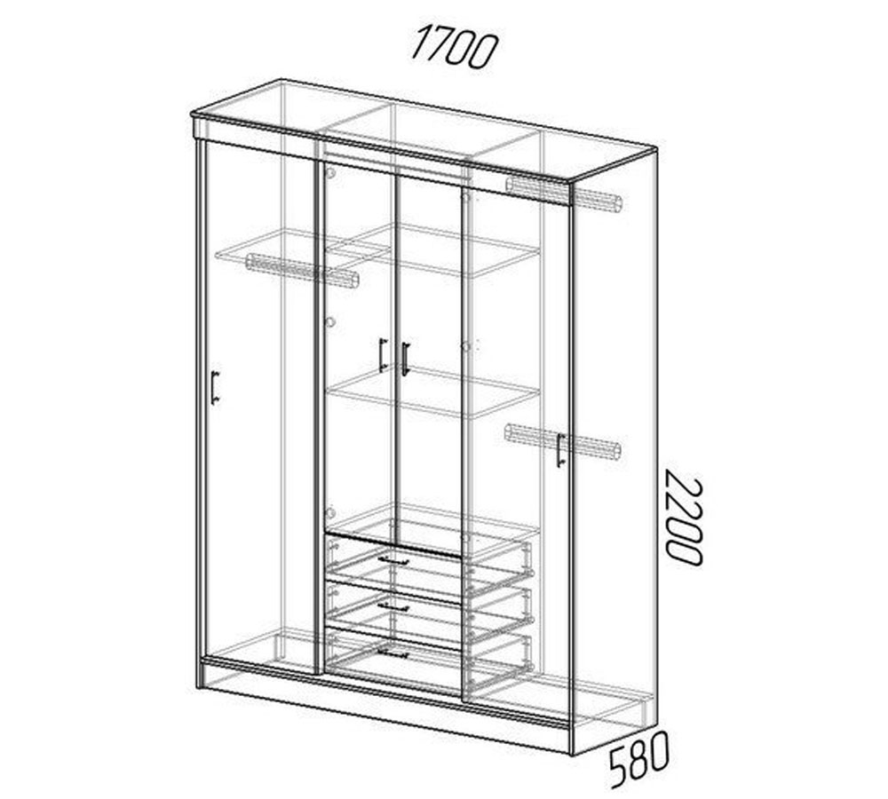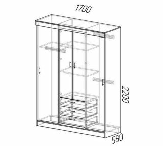 Практичный и вместительный, идеально впишется в интерьер. Содержит отдел с антресольной полкой и штангой для вешалок, отдел с полками, два выдвижных ящика и отдел с двумя штангами для вешалок.