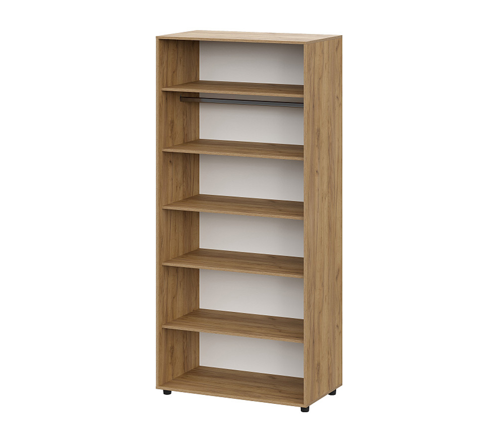 В шкафу сверху одна вязка, под ней штанга металлическая, ниже четыре съемные полки. Фасад вкладной. Сборка корпуса не универсальная. Задняя стенка из ЛДВП. Створки — одна с фрезеровкой, другая — без фрезеровки. Максимальная нагрузка на полку - 5кг.