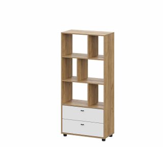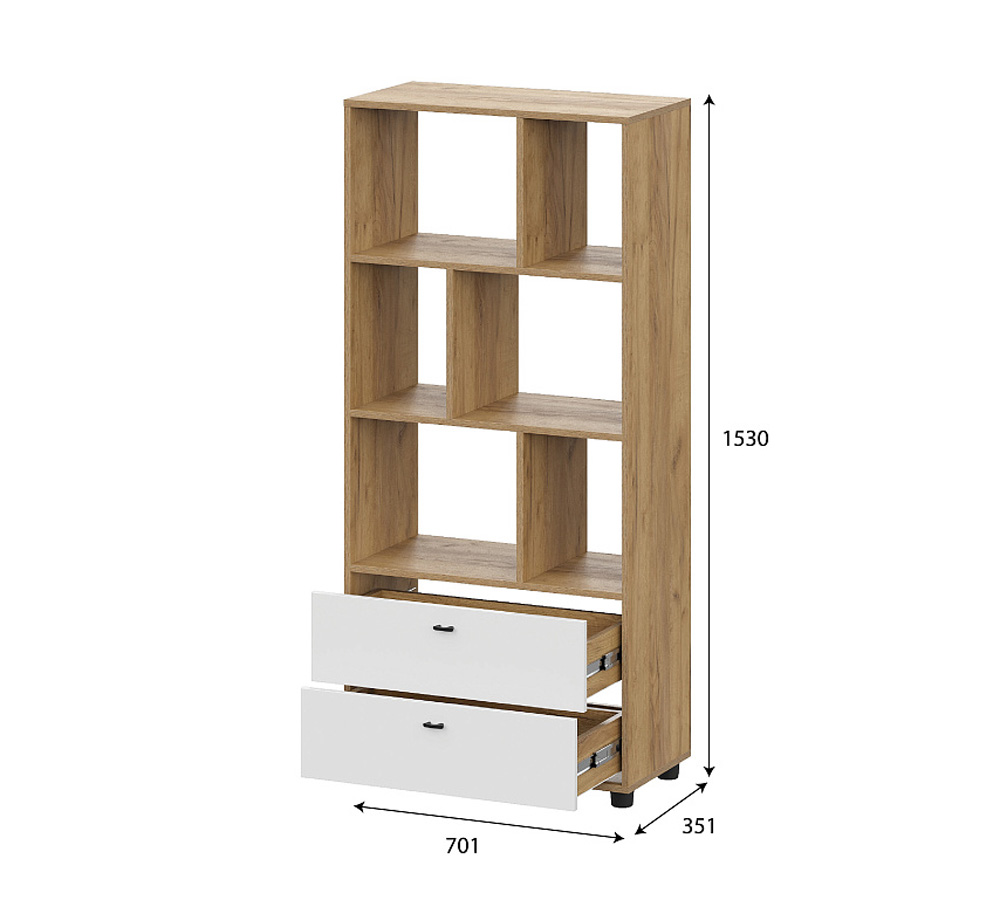 Стеллаж имеет два выдвижных ящика в нижней части (габариты ящика внутри (ШхВхГ) 610х120х284мм). Над ящиками располагаются открытые секции в шахматном порядке. Размеры секций (ШхВхГ) 406х333х350мм и 246х333х350мм. Конструкция ящиков без торцевой с пазом. Фасад вкладной. Сборка корпуса не универсальная. Стеллаж без задней стенки. Максимальная нагрузка на ящик - 5кг. Максимальная нагрузка на полку - 5кг.