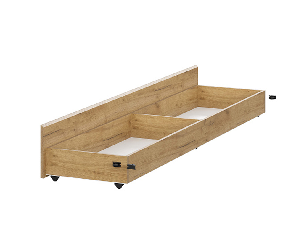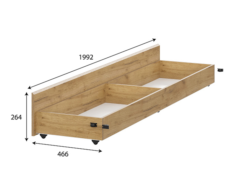 Ящик для кровати (ШхВхГ) 1992х264х466 мм Устанавливается на выкатных роликах. Ящик разделяется по центру перегородкой Габариты каждой секции внутри ящика (ШхВхГ) 946х132х418мм. Максимальная нагрузка на ящик 5кг.