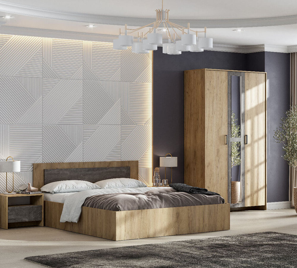 Каркас кровати полностью изготавливается из ЛДСП в цвет корпуса, за исключением внутренних, невидимых деталей, изготавливаемых из неламинированного ДСП.