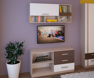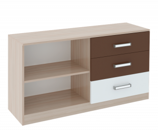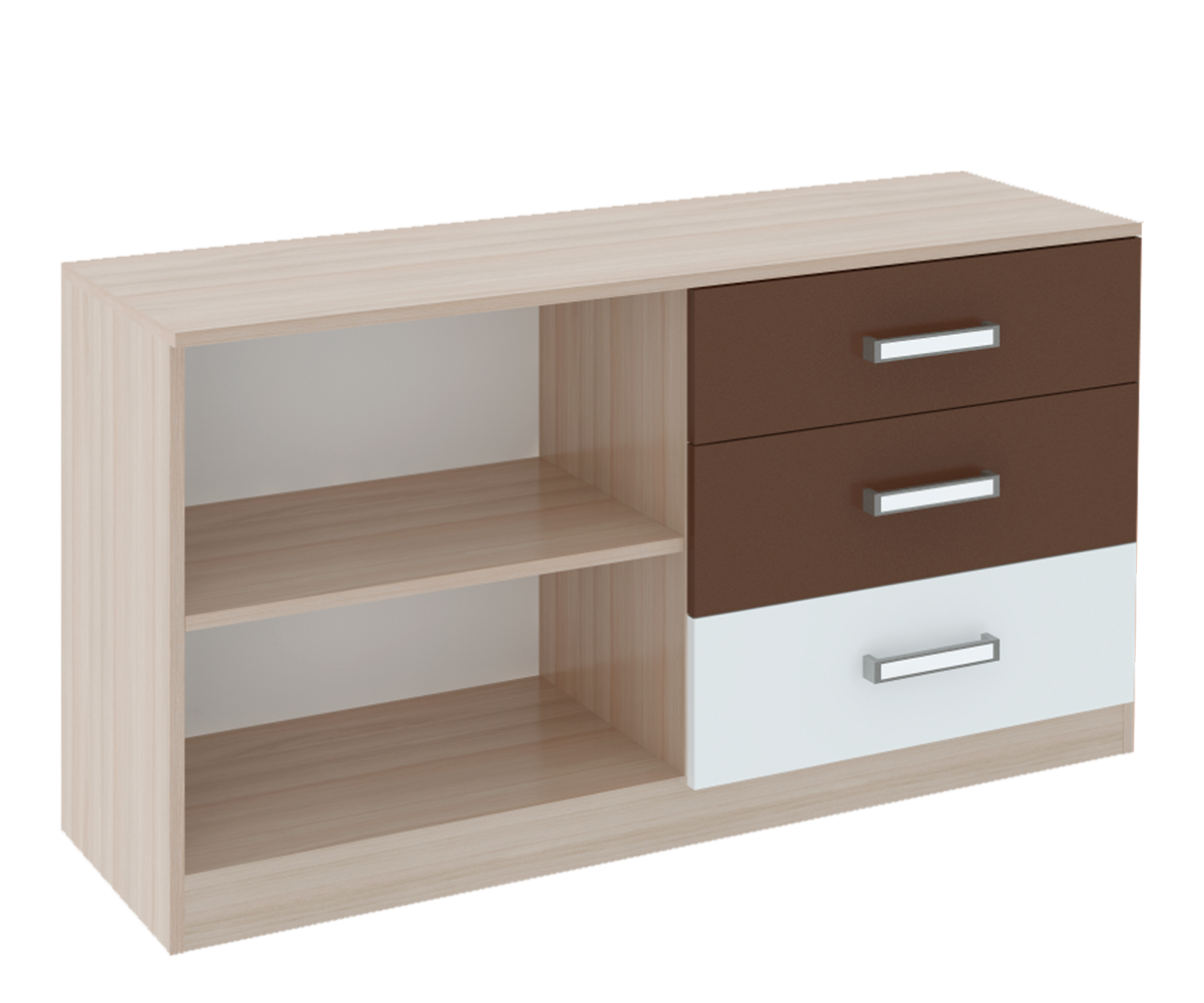 Тумба ТВ с тремя ящиками и открытым отделом с полкой под видео аппаратуру. Модульная система позволит доукомплектовать в едином стиле детскую комнату.
